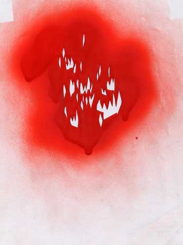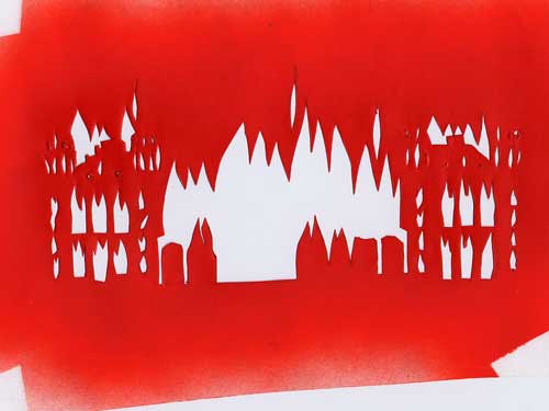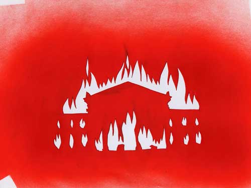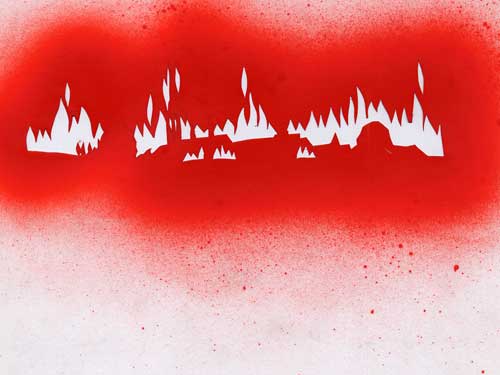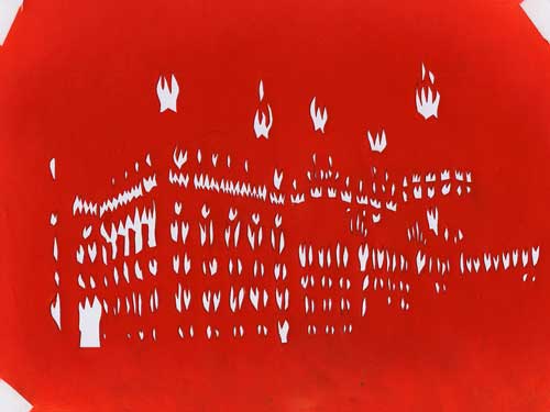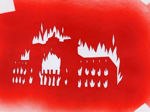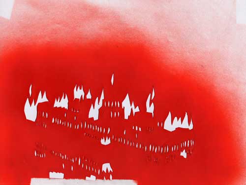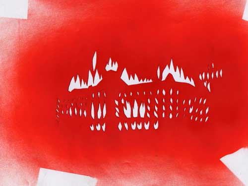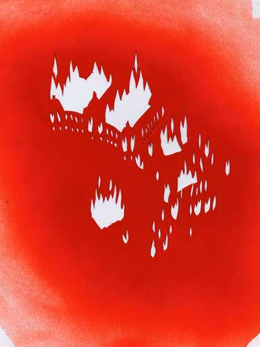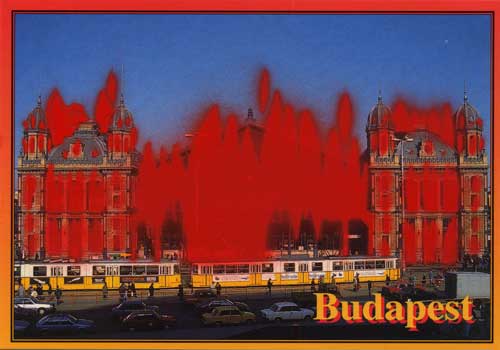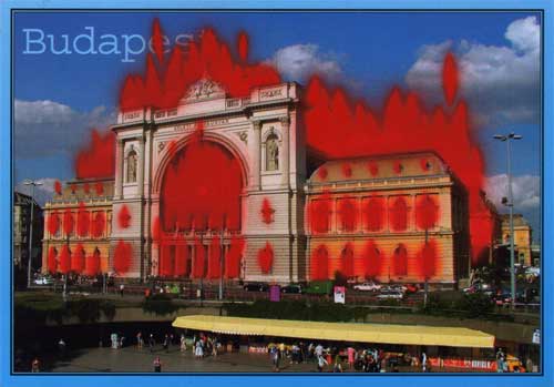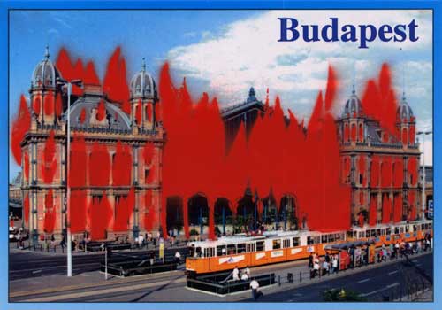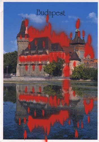 Chaque jour durant tout le mois d’octobre j’ai incendié, en cartes postales, la grande majorité des monuments historiques de Budapest. Sans aucun critère de sélection, j’ai brûlé trente et une des architectures emblématiques de la ville. Toutes ces cartes postales ont été numérotées puis envoyées, conformément à leur usage. Le message était identique pour tous les destinataires : « En guise de stratégie n°1, j’ai essayé l’assaut direct. Mais ce n’était qu’un artifice. Depuis, c’est l’état de siège. » Reste, en guise de témoignage de cette folie incendiaire, des petits bouts très fragiles, bombés à la peinture rouge, de dentelle de calque.