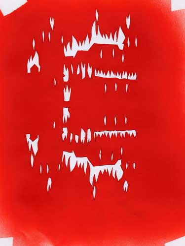 Papier calque, peinture acrylique vermillon, environ 10 x 15 cm chacune