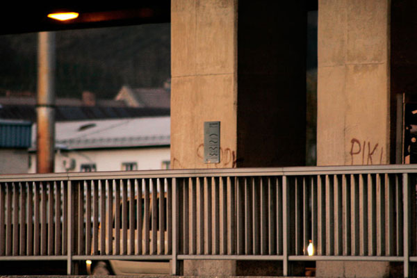 Panneau urbain accroché sur un pilier du 1er étage du Double Pont de la Voie Rapide traversant la rivière Drava de Maribor, cette plaque d’aluminium gravée présente le tableau de calculs effectués par un physicien slovène à la demande d’Anne-Valérie Gasc. Cette table indique le panel des fréquences susceptibles de faire entrer en résonance une partie du pont et, à terme, de le détruire.