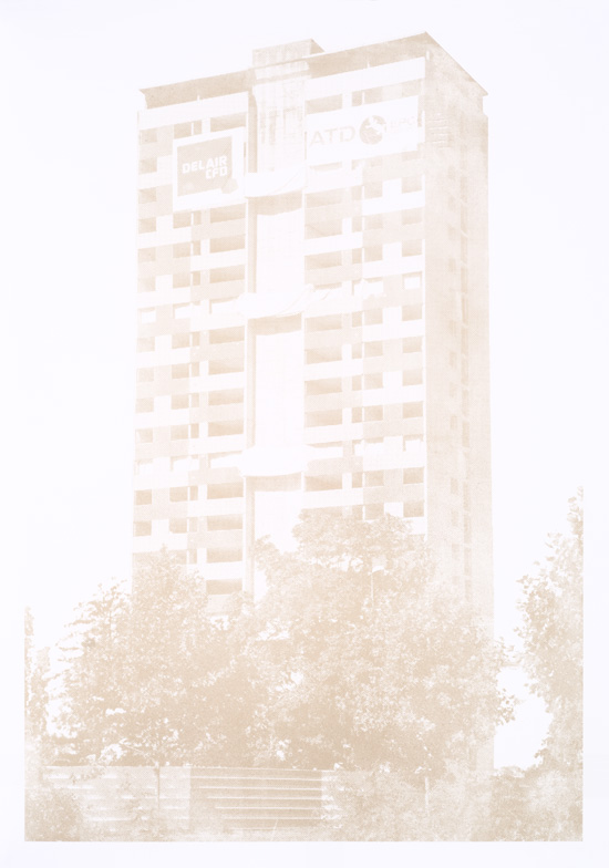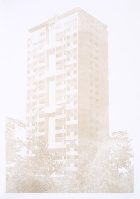 Sérigraphie à la poudre de béton de la Tour Genêt démolie à l’explosif le 26 juin 2011 à Meaux, 70 x 100 cm