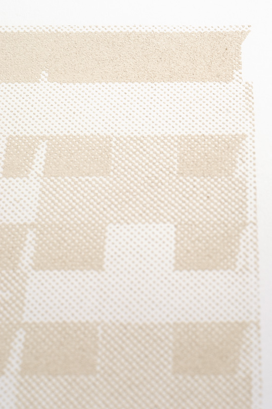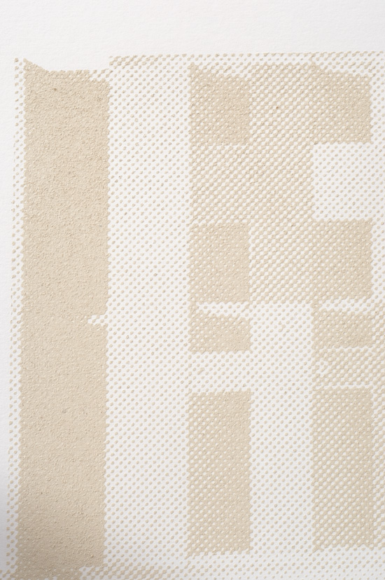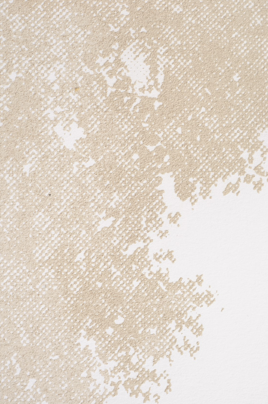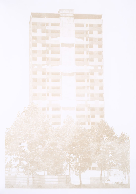 A l'atelier Tchikebe!, les décombres réduits en poudre sont tamisés sur la couche de colle qui a remplacé l'encre à sérigraphie. Lorsque le support est redressé, la poussière non-encollée s'effondre dans un nuage poudreux tandis que jaillit, à rebours de la démolition, l'image fantomatique des bâtiments. La couleur des gravats, d'un gris-crème diaphane, compose un camaïeu très doux avec le blanc du papier. Les figures des tours se révèlent d'une telle ténuité qu'elles s'apparentent à des visions de Saint-Suaire. De même que le voile de Véronique est autant icône que relique, la vue qui nous apparaît des bâtiments n’est pas plus image qu’elle n’est matière, prise dans la circularité d’une effigie physiquement constituée par son propre référent. La survivance de cet ensemble urbain, symbole d'une époque qui s'exile doucement dans l'inactuel, se tient encore devant nous, spectrale, aussi discrète qu'elle est opiniâtre. Sa représentation est doublement constituée d’abord par son propre référent, par l'effet du procédé photographique, dont les objets émanent physiquement de ce qu'ils saisissent, puis par le protocole quasi transsubstantatoire qui métamorphose les gravats de l'immeuble détruit en monument commémoratif à l'effigie de ce dernier. Entre visage et cendres, l'image des tours s'est assise dans sa propre chair comme le souvenir du disparu l'est dans son urne.