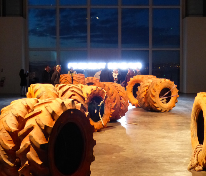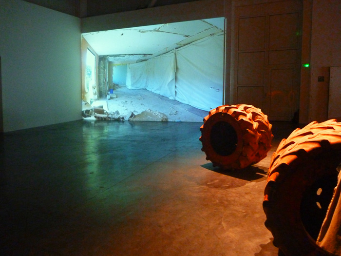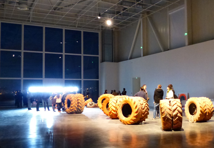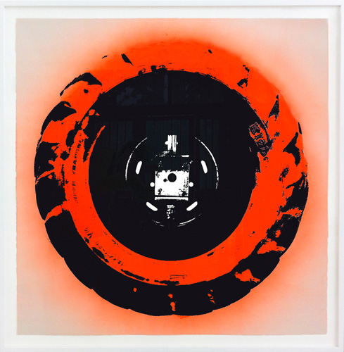 La sérigraphie ici présentée fait le portrait de cet oeil photographique : l'opercule central de l'image désigne le lieu de l'objectif de la caméra. L'auréole irradiante marquée manuellement à la bombe de chantier orange, occupe l'espace de la feuille là où, en volume, le pneu de grande dimension vient contenir le cœur du dispositif.