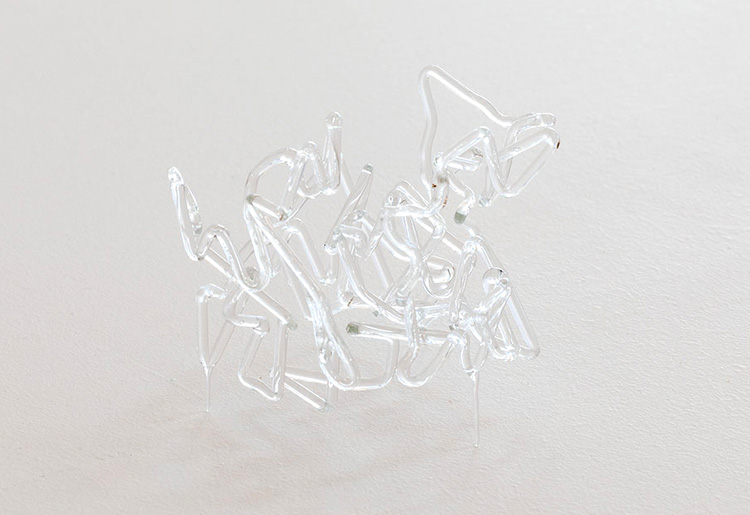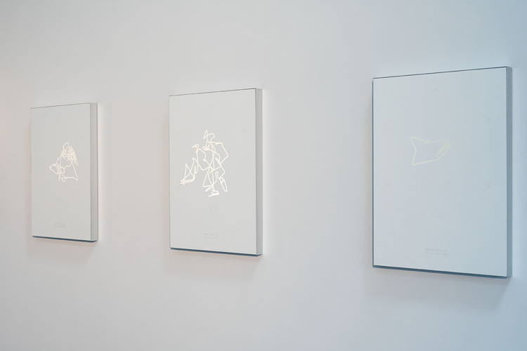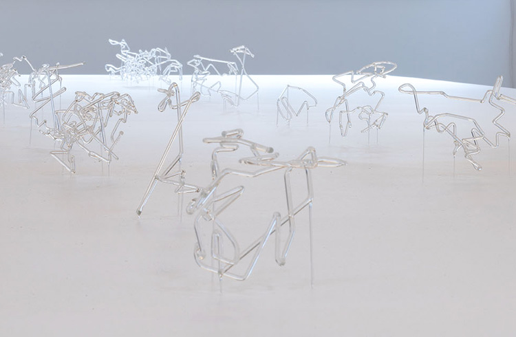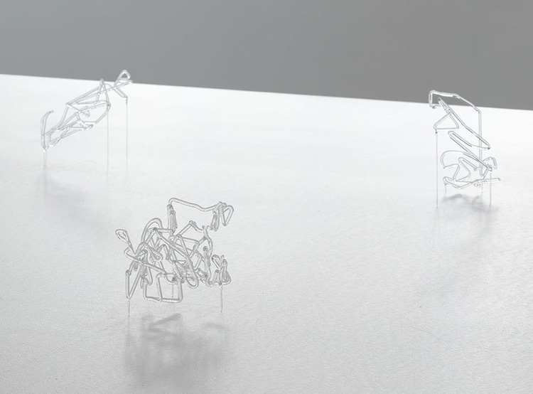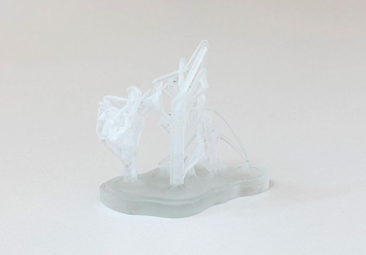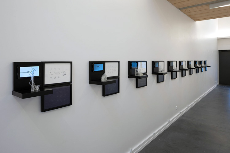 Installation techniques mixtes, 1 vidéo HD, couleur, muette, sur tablette 7'', 1 maquette (impression stéréolithographique) en résine transparente, 1 dessin transféré par papier carbone bleu sur papier machine (format A4), 1 transfert papier carbone bleu (format A4)