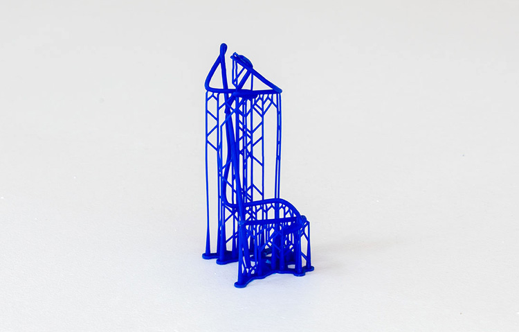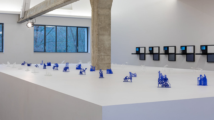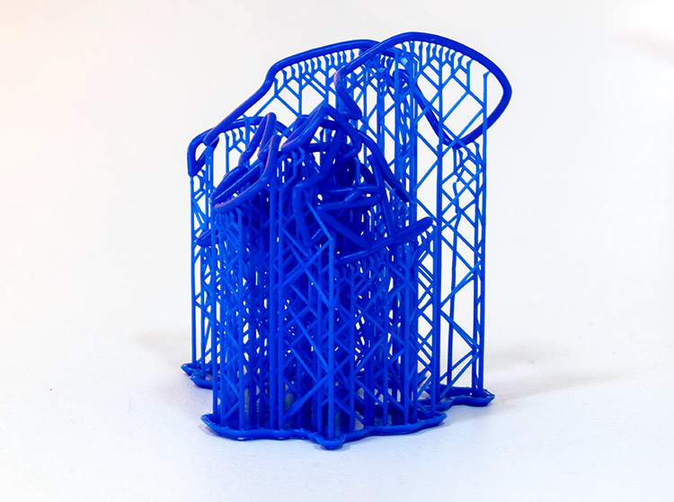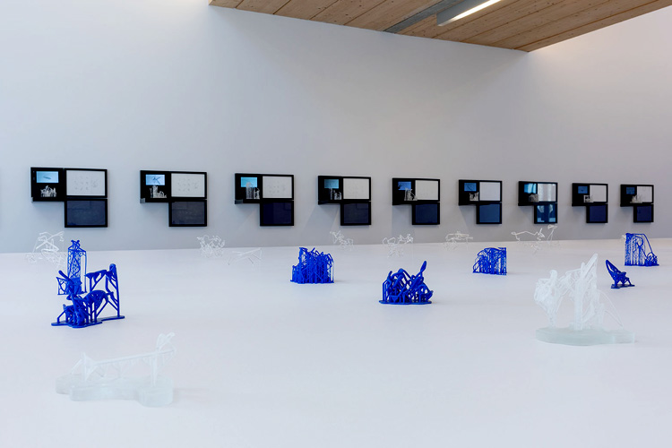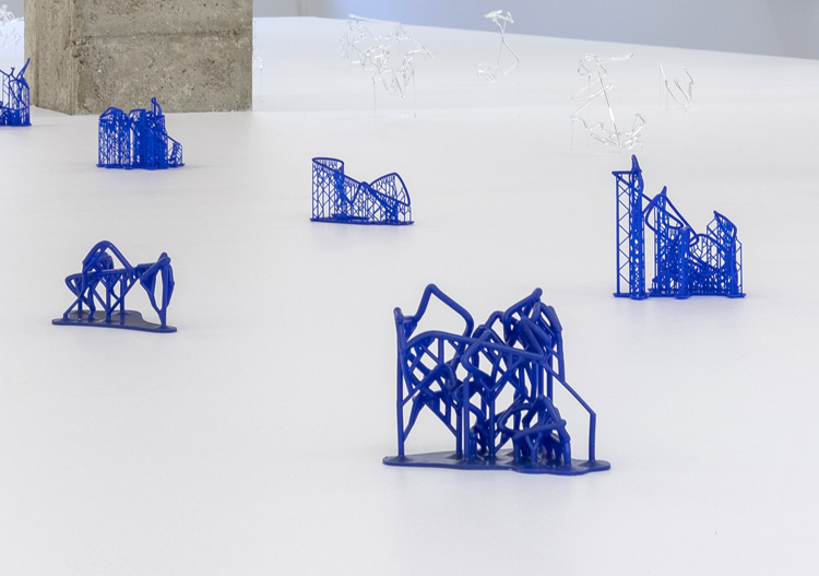 Série de 10 volumes imprimés en 3D (stéréolithographie), résine calcinable (bleue), 20 x 20 x 20 cm env./pièce |
