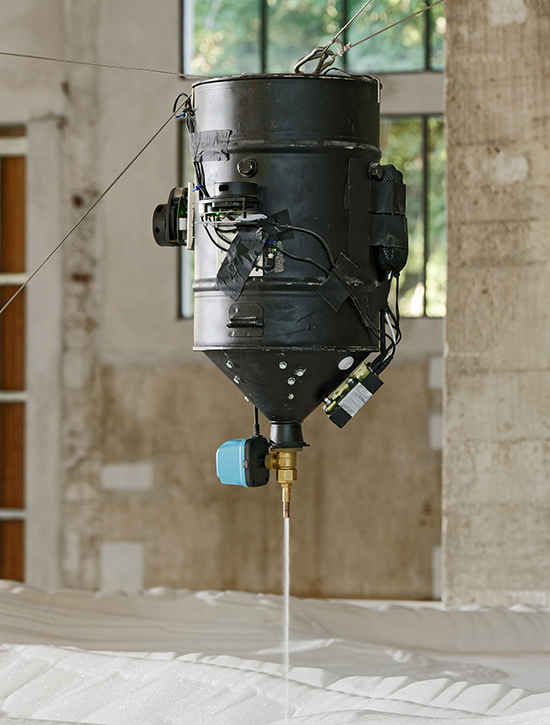 Œuvre robotisée réalisée en résidence par l'artiste Anne-Valérie Gasc, accompagnée par la commissaire d'exposition Emmanuelle Chiappone-Piriou.