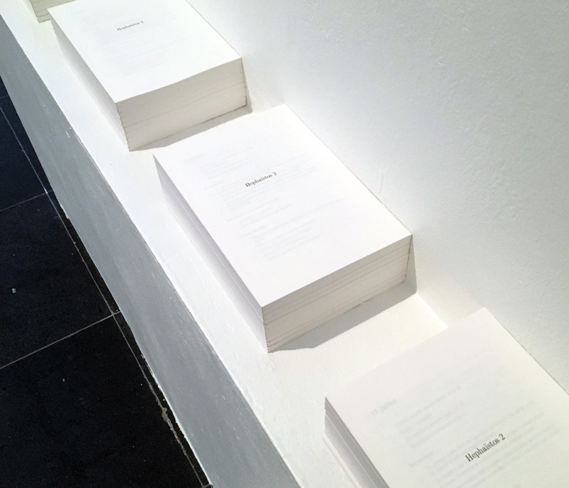 Héphaïstos 2 est le journal de bord tenu, à la demande d’Anne-Valérie Gasc, par Nicolas Lemaitre pendant la durée de l’exposition Vitrifications qui a eu lieu du 22 juin au 1er septembre 2019, dans la grande halle du centre d’art contemporain Les Tanneries à Amilly. Le texte a été mis en forme via le système de composition de documents scientifiques LATEX.