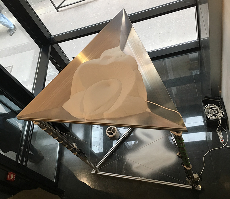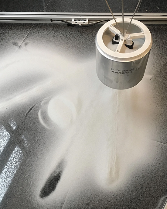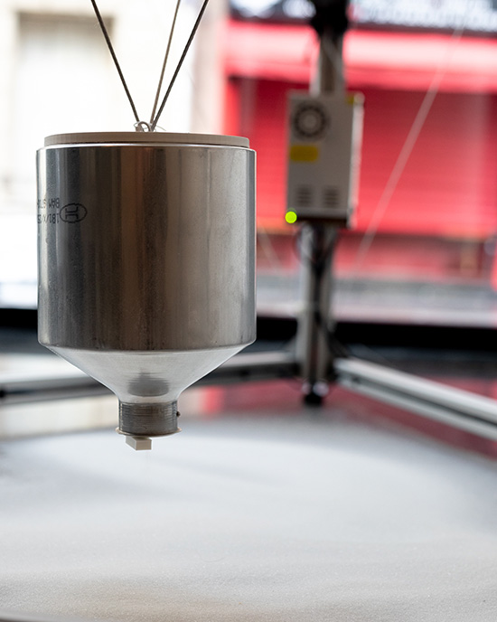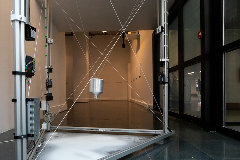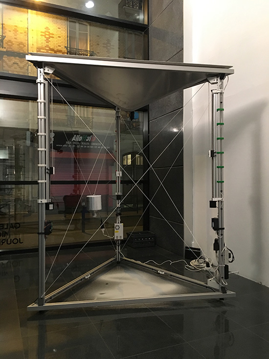 | Version autonome dite « machine célibataire » du dispositif automatisé de l’installation in situ Vitrifications (Centre d’art des Tanneries, Amilly, 2019), il s’agit ici de proposer une oeuvre robotisée, à la présence décontextualisée, qui fonctionne comme un sablier-imprimeur en 3D : la machine manifeste d’une production vaine qui simultanément construit un volume qui s’effondre et mesure le temps qui s’écoule à édifier cette destruction. Point de sable pourtant mais la matière scintillante et volatile de micro-billes de verre, celle-là même qui est floquée sur les Tectorium et qui rappelle au regardeur intrigué, la vacuité de nos architectures contemporaines de verre. |