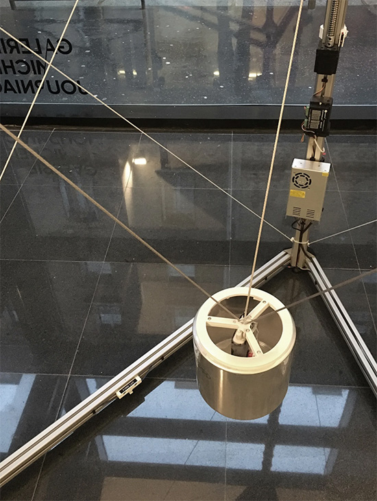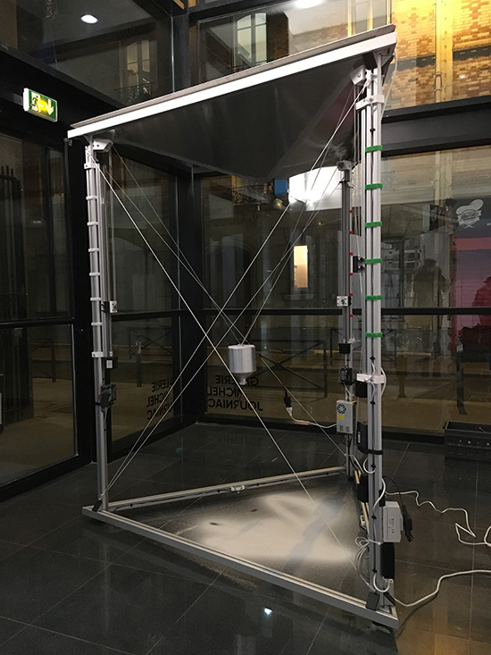 Système robotisé : structure triangulaire en profilés alu, buse d’impression, réservoir en pyramide alu, moteurs, alimentation, ordinateur, borne wifi, vis sans fin, câbles, micro-billes de verre, h : 200 x 900 de rayon