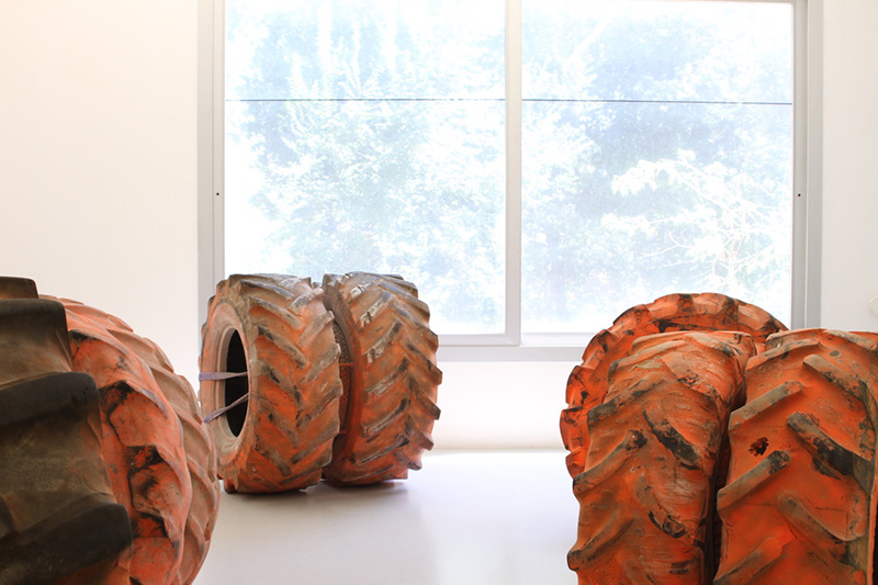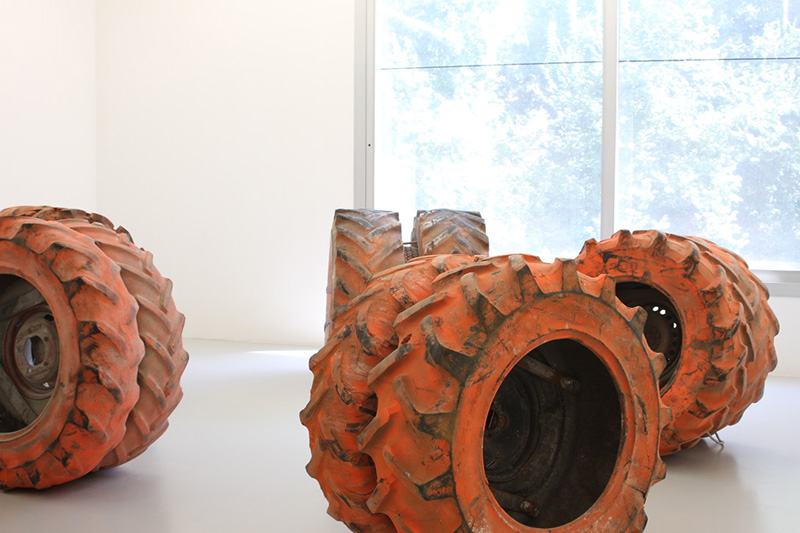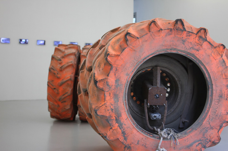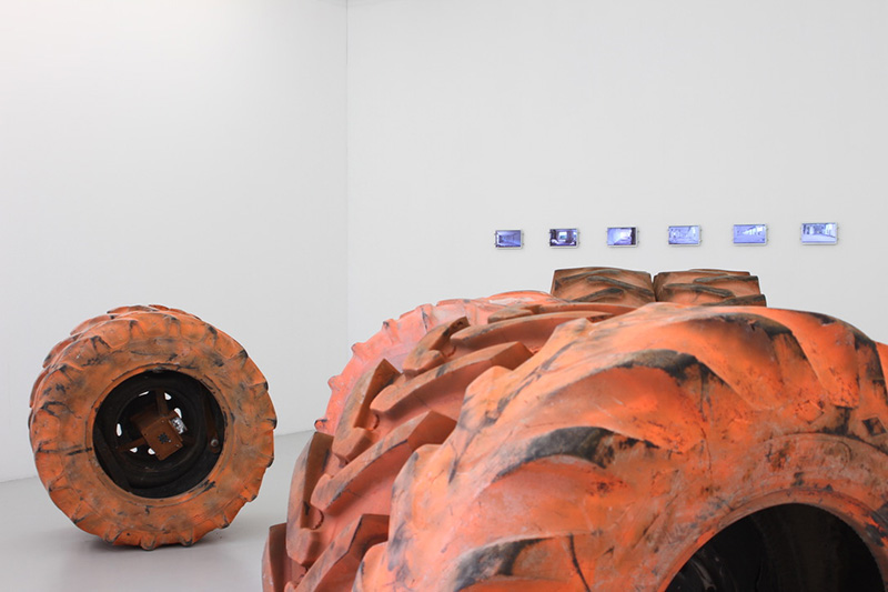 Pneus, bombe de chantier orange, métal, caméras, enregistreurs son, sangles de levage chaque Ø120x100cm