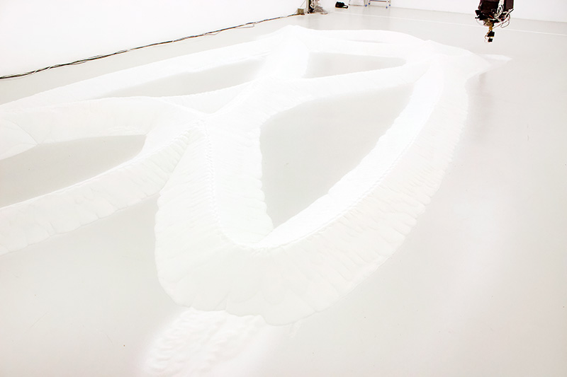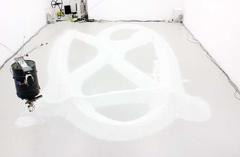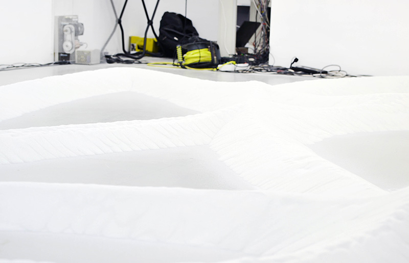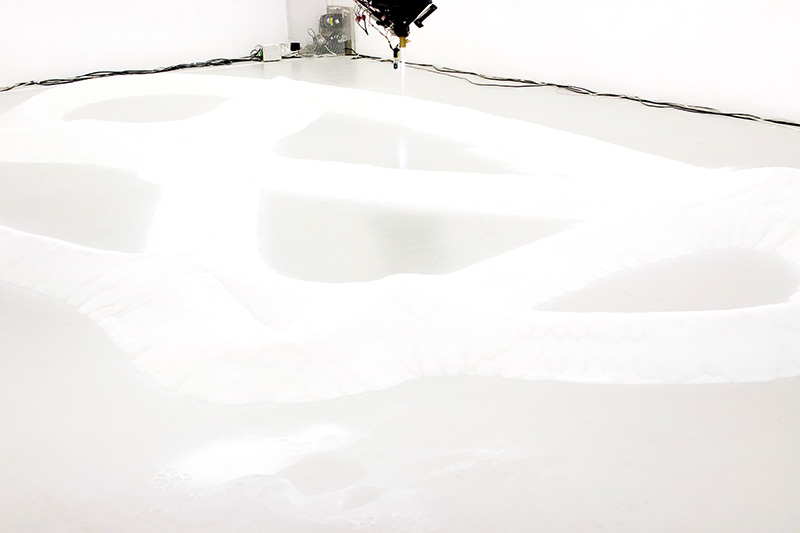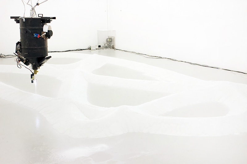 L’utilisation de micro-billes de verre creuse l’écart entre l’automatisation implacable du robot qui imprime un modèle numérique et la dépose d’une matière non liée, informelle et instable: l’échec de l’édification engendre un paysage de dunes cristallines qui s’effondrent sur elles-mêmes au fur et à mesure de leur élévation.
