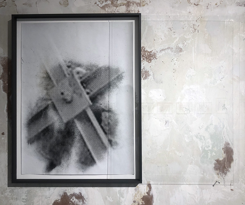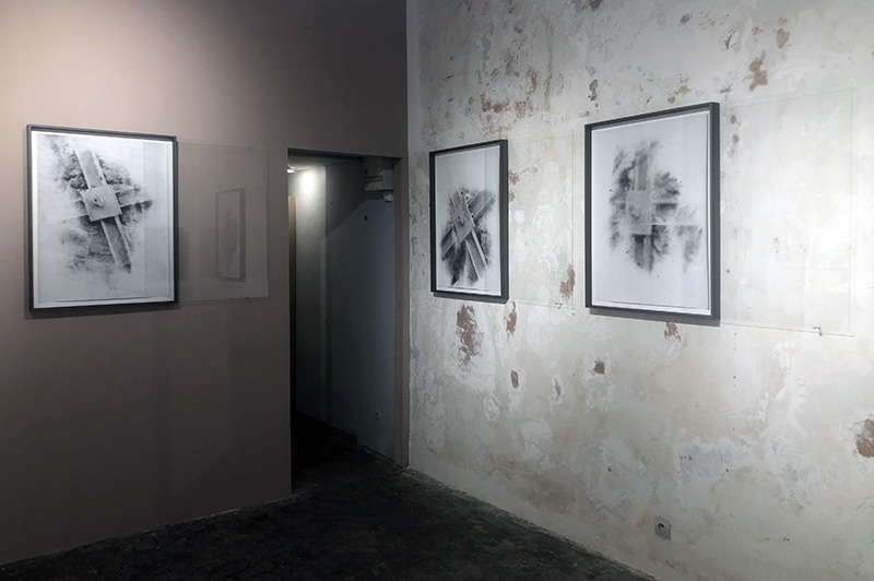 Anne-Valérie Gasc présente Première ligne, une série de huit croix de saint-André sérigraphiées à la poudre noire sur du papier ignifugé. Figures affaiblies d’objets de renforcement de l’architecture, ces images mettent en tension la force d’une ligne de front et la fragilité d’une écriture inaugurale. Pour exacerber cette contradiction, les tirages seront successivement brûlés à l’occasion de moments performatifs : la combustion de la poudre noire marquera définitivement le papier de l’image des croix. Dès lors, c’est dans le geste destructeur que s’anime ici la puissance des œuvres rappelant — à l’instar de William Turner qui, en 1832, dynamita les toiles alentours à la sienne, d’une seule tâche de peinture rouge ajoutée in extremis à sa marine Helvoetsluys — que tout vernissage n’est pas un moment d’achèvement du travail mais, au contraire, l’instant de son amorçage. L’œuvre Première ligne d’Anne-Valérie Gasc ne prendra son autonomie qu’à l’instant périlleux de sa mise à feu. |