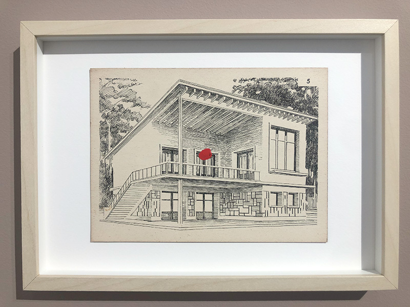 Série de 20 planches imprimées extraites de l’édition Petites maisons pour l’après-guerre _ 40 planches (A. Dulong, Paris, Ch. Massin, 1946) touchées de peinture acrylique rouge de cadmium, 21 x 15,5 cm |