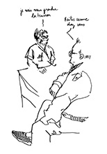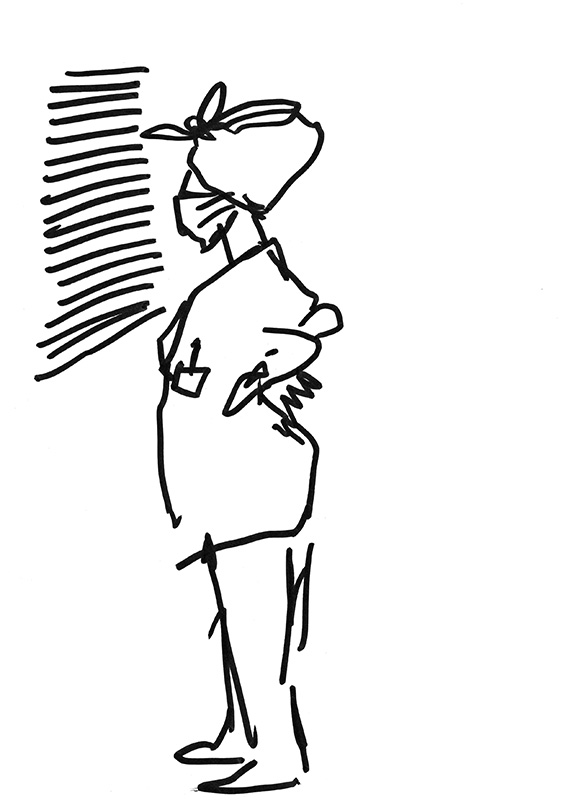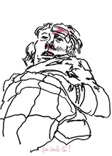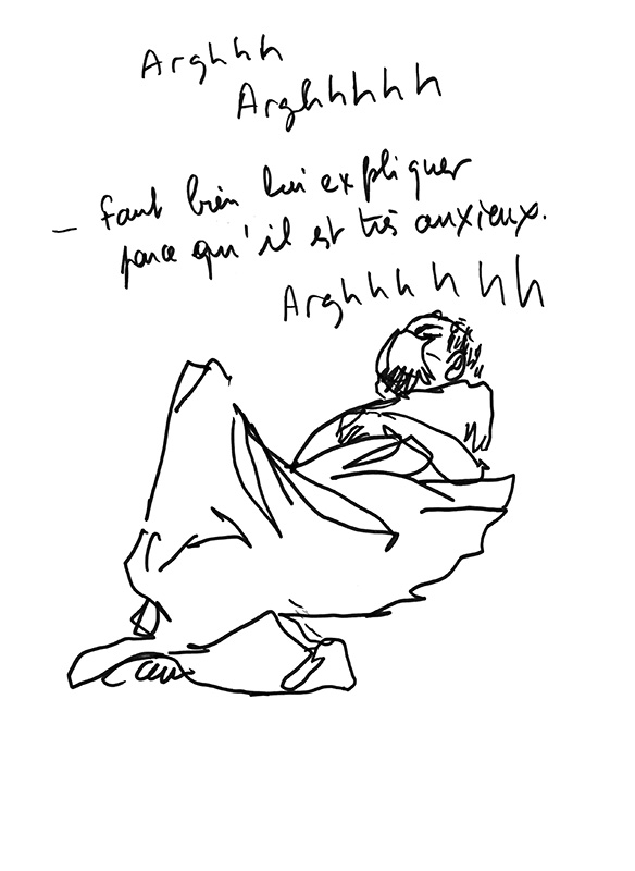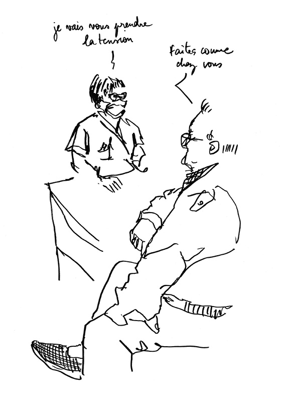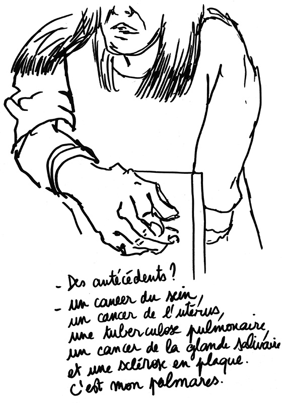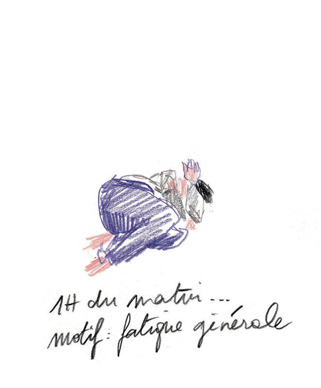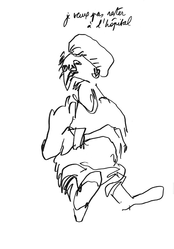 À n’importe quelle heure et pour parfois pas grand chose, ils arrivent dans ce service déjà engorgé. Je me demandais bien ce qui pouvait pousser quelqu’un à venir à 3h du matin pour un mal de ventre. Souvent, ils demandaient un Irm ou un scanner. Je dessinais et me rendais bien compte de la force du dessin. L’image en elle-même importait peu, ou plutôt était comme un effet secondaire. L’important c’est d’abord d’être représenté. Ces pauvres qui défilent, ceux que les médias, les politiques ou les bailleurs sociaux ont abandonné, c’est bien une image qu’ils attendent. Et ils resteront là toute la nuit s’il le faut, pour le temps d’un examen, accéder à un peu d’égalité face à la représentation.»