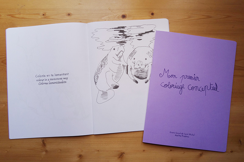 Ce coloriage s’amuse des principes de l’art conceptuel : pour chaque dessin à colorier, un protocole de dessin est proposé, sous la forme d’une instruction.