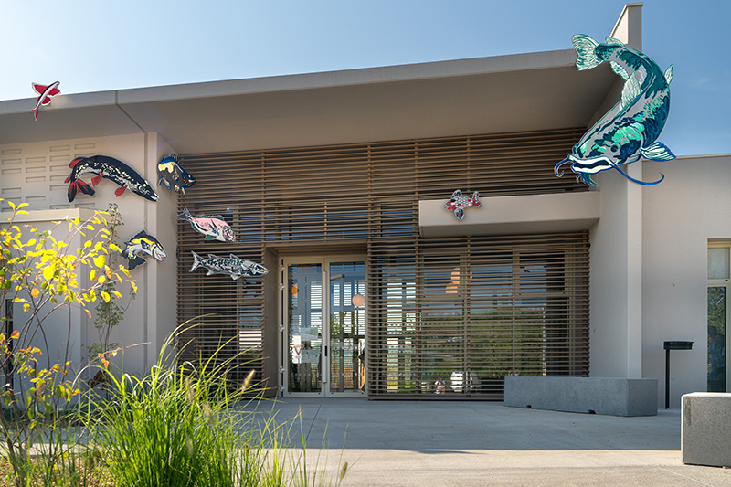 Ce banc de poissons a la particularité d’être constitué d’espèces diverses, poisson d’eau de mer et d’eau douce réunis ici pour une stratégie commune. L’instinct grégaire permet au groupe d’exister et à l’individu de se réaliser. La façade du bâtiment accueille cette allégorie de l’école, celle d’un lieu propice aux changements de milieu.