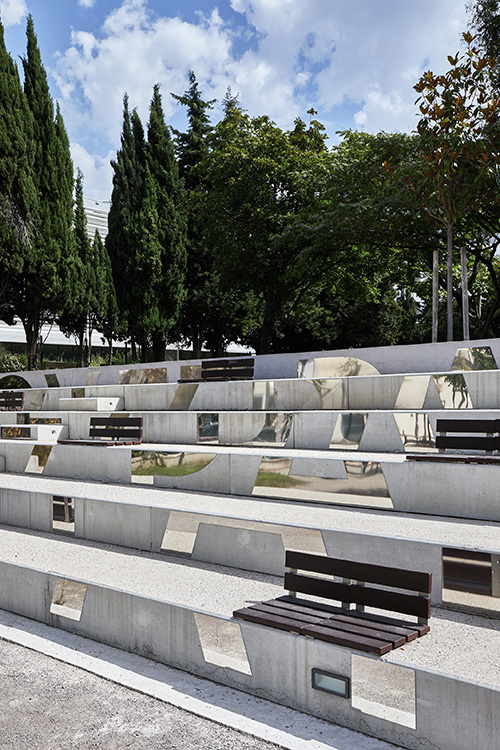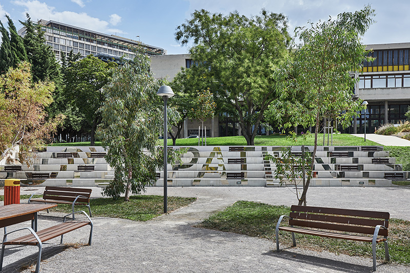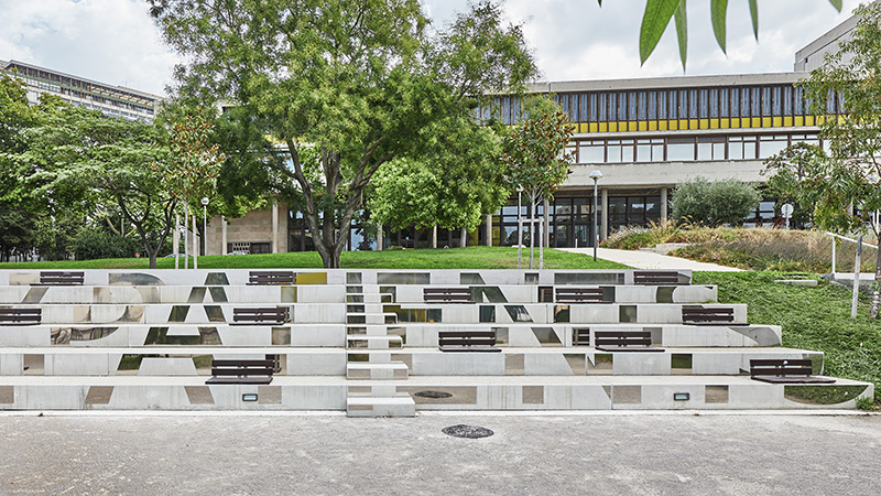 J'utilise les gradins de béton sur lesquels les étudiants feront leur pose et mangeront leurs sandwiches. Ils se trouvent face au bâtiment de Vezzoni et épousent le dénivelé qui mène au bâtiment principal conçu par René Egger. Ils deviennent le socle de l'œuvre tout en conservant leur usage. On peut la toucher, se voir dedans, elle fait partie du paysage. |