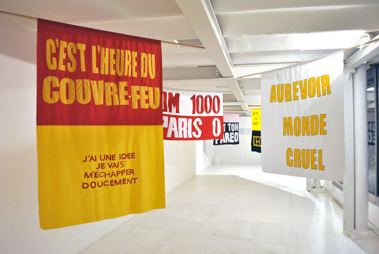 Art-cade est en centre ville. Y venir des quartiers Nord est synonyme d'expédition. Je voulais une conquête. C'est ainsi qu'ont pris forme les bannières. Elles représentent le groupe rallié derrière elles. Sont exposés les planches originales d'où sont tirés les slogans, comme un récit de l'expérience. |