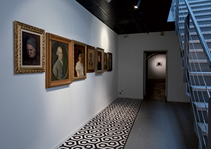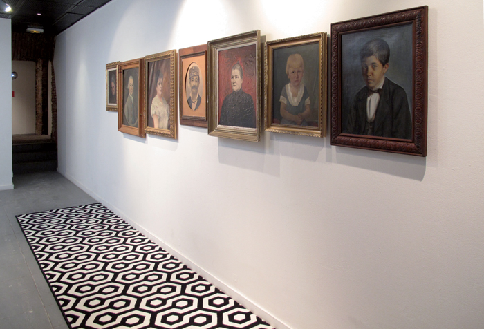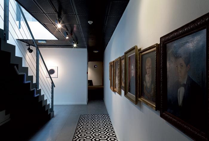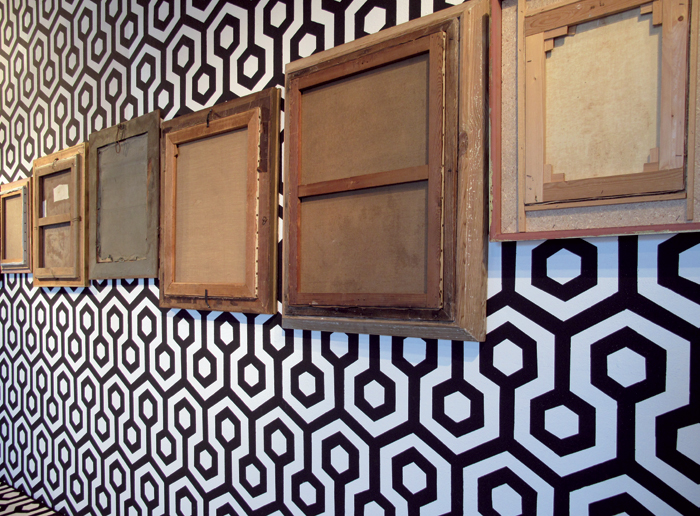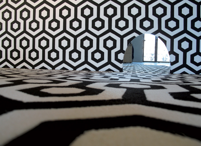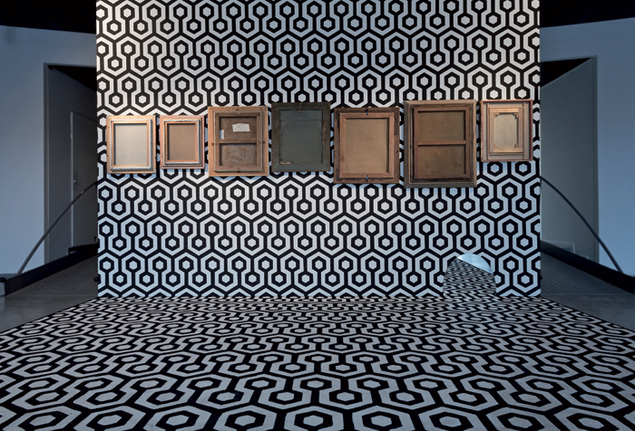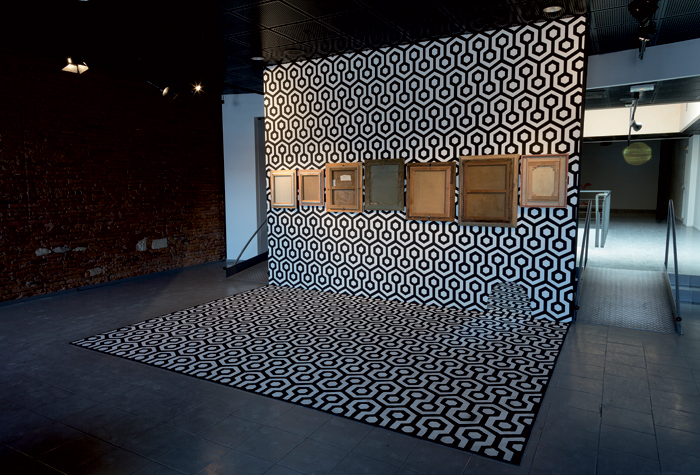 Peinture murale, damier en moquette, tableaux, miroir