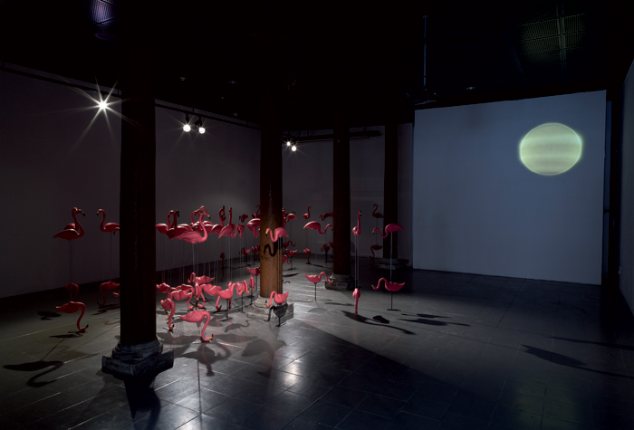 Impression numérique sur papier intissé, porte va-et-vient en bois et métal, bottes de paille vidéo projection en boucle (durée 53’)