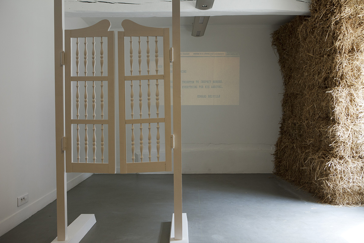 Comme dans la tradition du cinéma sans image des Lettristes (internationaux ou pas), le spectateur est invité à combler les vides. Ici ce n'est pas un débat qui est attendu, mais plutôt un raccommodage. On nous sollicite pour rapiécer une histoire selon notre bon vouloir, notre bon pouvoir – celui de l'imagination. Pas chiche, l'artiste a savamment orchestré dans l'espace de projection une suite d'objets comme autant d'indices potentiels. D'aucun parlerait du syndrome du chandelier dans la bibliothèque, mais présentement, le décor est bien plus trivial. Le lieu esquissé semblerait plus indiqué pour s 'adonner à la boisson qu'à la culture livresque. On s'y ferait dézinguer plus vite que son ombre avant d'avoir pu évoquer la potentialité d'un débat d'idées. Les portes de saloon, battantes sur leur châssis, esseulées au milieu de l'espace pourraient avoir été oubliées là par un bruiteur parti chercher pitance ailleurs quand il sût qu'il s'agissait d'un film muet. L'architecture sommaire de bottes de pailles obstrue la lumière naturelle et, par là-même, fait de cette pièce une salle obscure. Quelques autres bottes flanquent le sol comme attendant qu'un quidam fasse l'expérience de cette durée avec en plus, des brins qui pénètrent superficiellement les chairs de son postérieur. Enfin, marouflé sur un mur comme le poster d'un sous-bois au petit matin dans la salle d'attente d'un ostéopathe, un paysage fait un pas de côté dans l'espace et le temps de la monstration. Par le truchement mécanique d'un logiciel de calibrage de trame, Aïcha Hamu a opéré sur cette figure typique une exagération de l'échelle qui nous oblige aux cent pas pour tenter d'en cerner le propos.