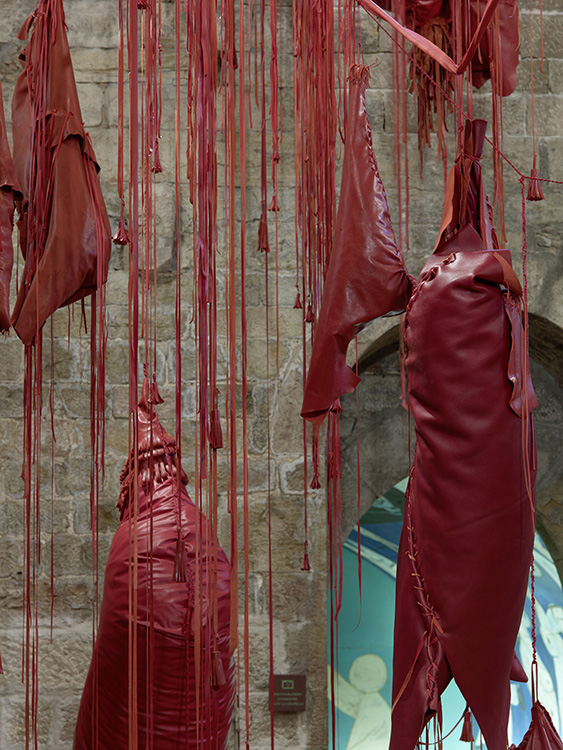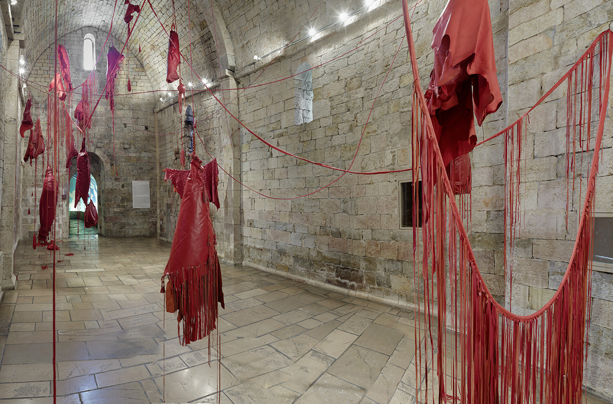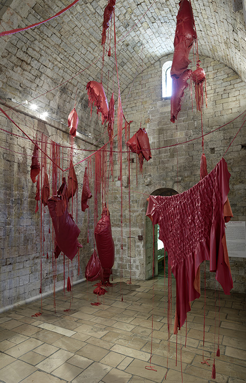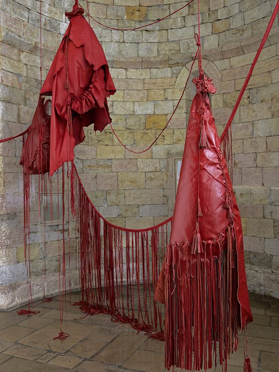 Peindre autrement, dessiner autrement. Telle est la proposition d’Aïcha Hamu qui, confrontée à un espace particulier – celui de la chapelle Picasso, La Guerre et la Paix à Vallauris – se voit pratiquement contrainte de trouver des solutions nouvelles. Comme les murs de la chapelle se prêtent mal à l’exercice, c’est dans l’espace que l’artiste va dessiner. Picasso déjà, il y a plus de cinquante ans, avait réalisé des dessins dans l’obscurité de l’atelier du Fournas à l’aide d’une lampe torche. Saisies par l’appareil photographique, les formes du faisceau lumineux que la main a créées, apparaissent sur le cliché. À son tour, Aïcha Hamu dessine dans l’espace au moyen de lanières de cuir rouge qui courent d’un point à l’autre ou qui, tressées en gros pompons, viennent le marquer de leur ponctuation écarlate. C’est tout un canevas de lignes souples et filantes qui vient habiter l’espace de la chapelle ou qui, en noeuds serrés, structure le vide de ses formes plombées. Dans cette installation, le choix du cuir n’est pas anodin. Ce matériau est riche de mille connotations en ce que, travaillé et usiné, il demeure encore et toujours de la peau. Il renvoie à celle du prisonnier lacéré par les coups du chat à neuf queues, ce fouet lui aussi tressé dans le cuir. Il garde en mémoire ou, pour mieux dire, il incarne le travail de toutes ces mains qui l’ont façonné, traité, coloré dans les peausseries artisanales comme il évoque les courroies qui servent à actionner les machineries des ateliers ou des théâtres. Lieux propices aux développements de l’imaginaire, ces derniers ouvrent sur le récit et la narration. À ce titre, l’oeuvre d’Aïcha Hamu est aussi bien le devant que l’arrière de la scène.