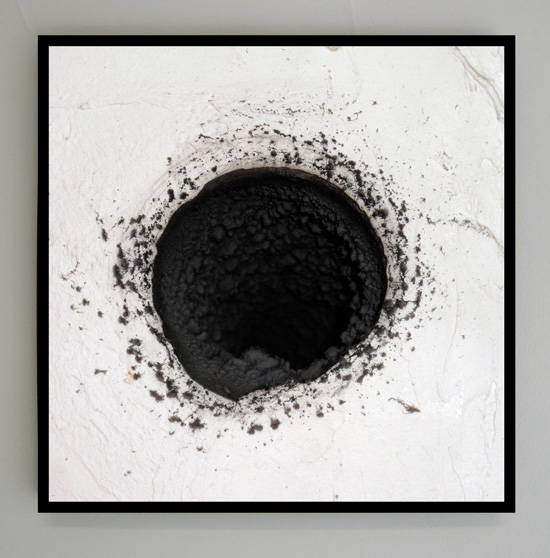 Et pendant ce temps-là, le feu brûle dans l'âtre. En y regardant de plus près, c’est l’âtre qui est dans le feu ou les deux ? Un living-room lambda reconstitué par la brigade anti-feu nous montre l'évolution d'un incendie de la naissance du foyer à l'embrasement général éclair : C’est un Flashover. Zoom arrière sur la catastrophe en devenir ou le fragment d'un décor posé là, non pas seulement une cheminée d'angle mais l'angle du salon tout entier qui trace ses limites dans un cadrage potentiel. Le tableau intègre une galerie de portraits (Spooks 4) s'inscrivant dans les ovales de leur sertissage originel et tracés au charbon à même le mur. Ils en sont sortis mais ne s’en sont pas vraiment sortis.