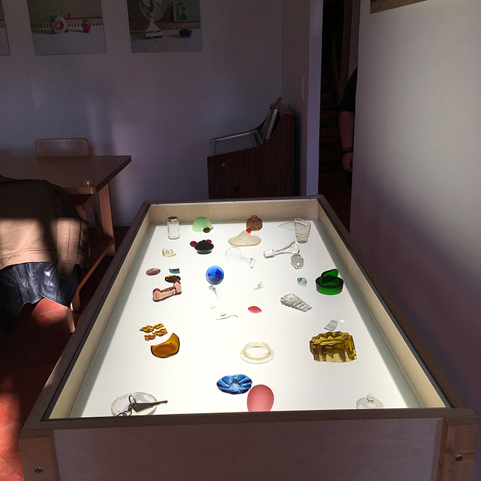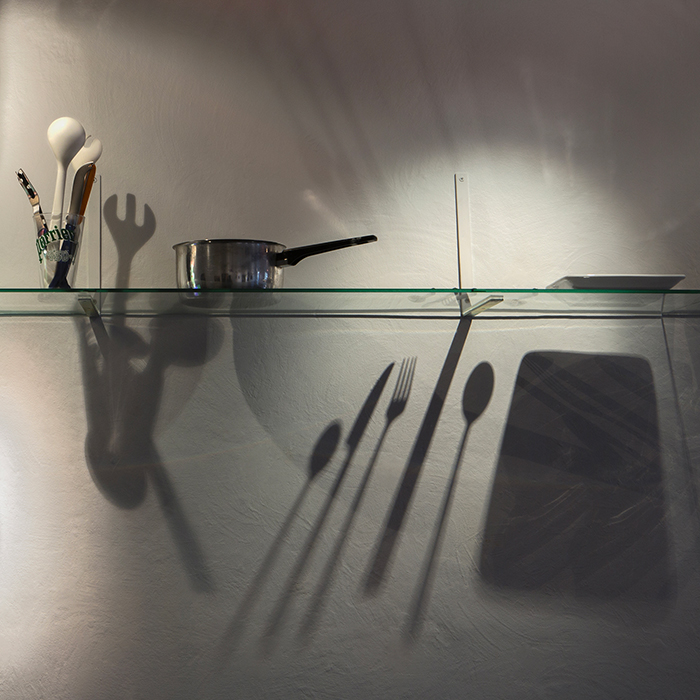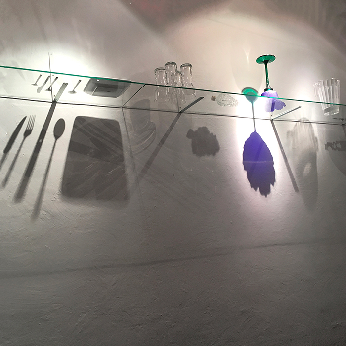 | Attention particulière /2, vitrine lumineuse, objets en verre venant de la sphère de la cuisine et de la table, Contact, tirage lambda 120 x 45 cm |