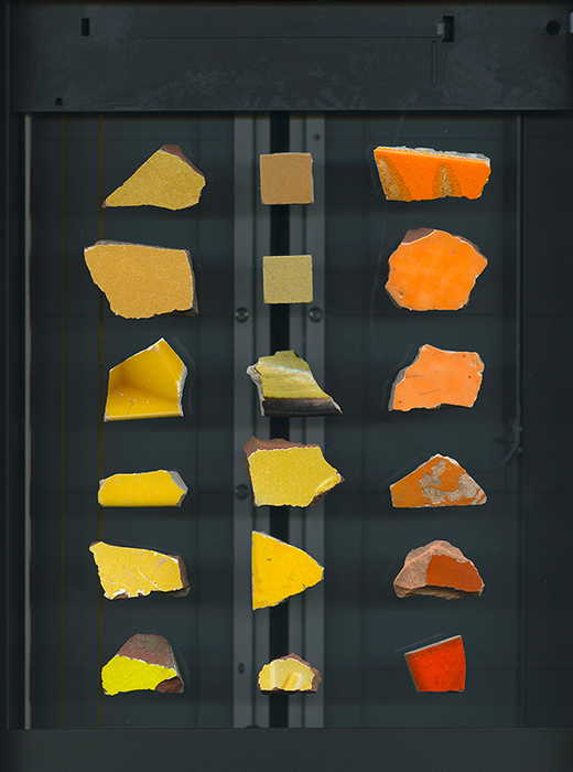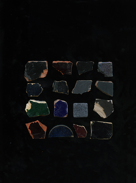 L’essentiel des fragments en céramique provient de balades dans la campagne. Malgré leur usure par les machines à remblayer les chemins, on peut y reconnaître l’ancien carrelage d’une cuisine ou d’une salle de bain. Mon geste de collecte d’abord, puis d’assemblage selon leurs coloris leur prête l’aspect d’un nuancier de peintre et écarte l’anecdote ou le sentiment de nostalgie.