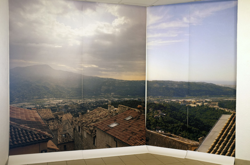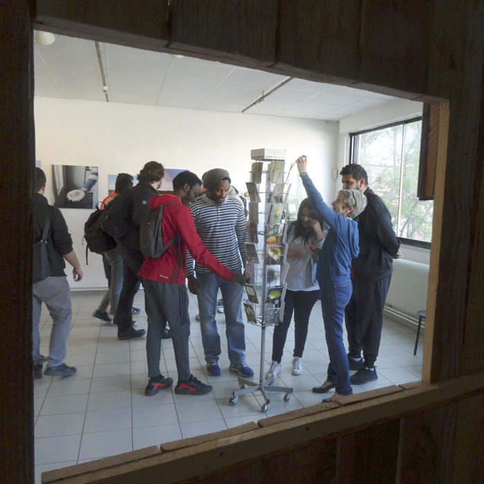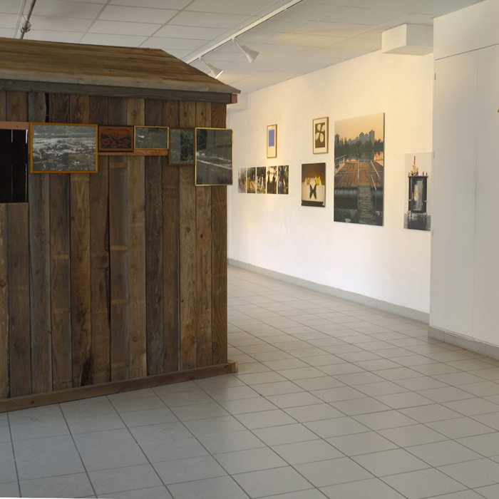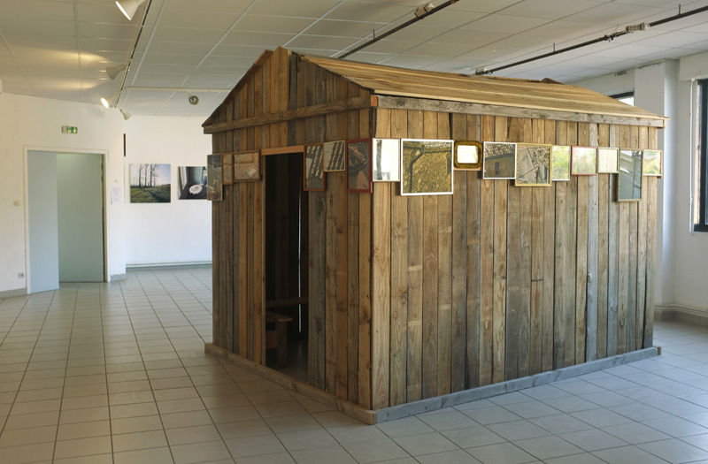 J’ai installé une hutte en bois au milieu de la salle d’exposition du lycée Antonin Artaud. Aucune image ne se trouve à l’intérieur de la hutte, seulement des bancs. Je les ai conçus en pensant aux pauses des élèves. Porte, fenêtre et toit ouvrent sur des photographies de l’exposition où une série d’images de paysages et d’objets évoquant la campagne invite à une balade : une sorte de passerelle entre un lieu d’étude et le “grand air“. |