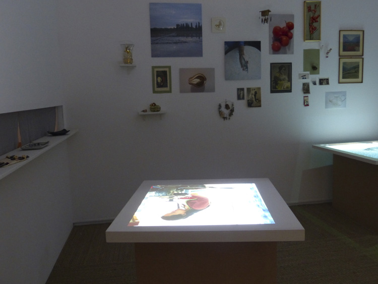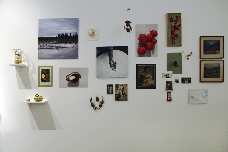 Au mur sont associés des objets et des images liés aux souvenirs personnels, mais aussi des images et des choses trouvées et gardées pour la beauté de leur forme ou l’étrangeté de leur aspect. L’étrange et le familier sont réunis dans un même mouvement de lecture.