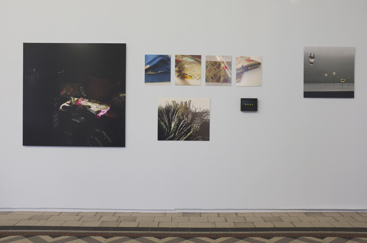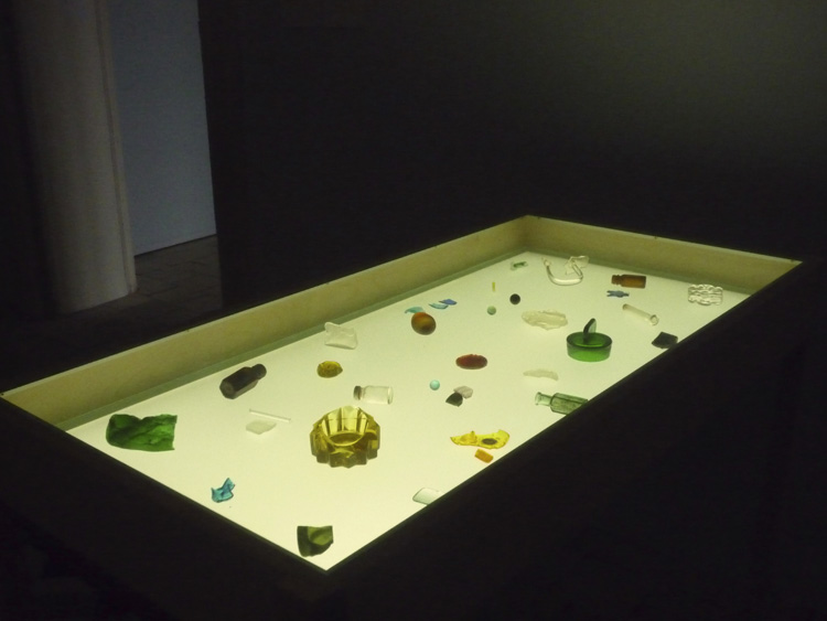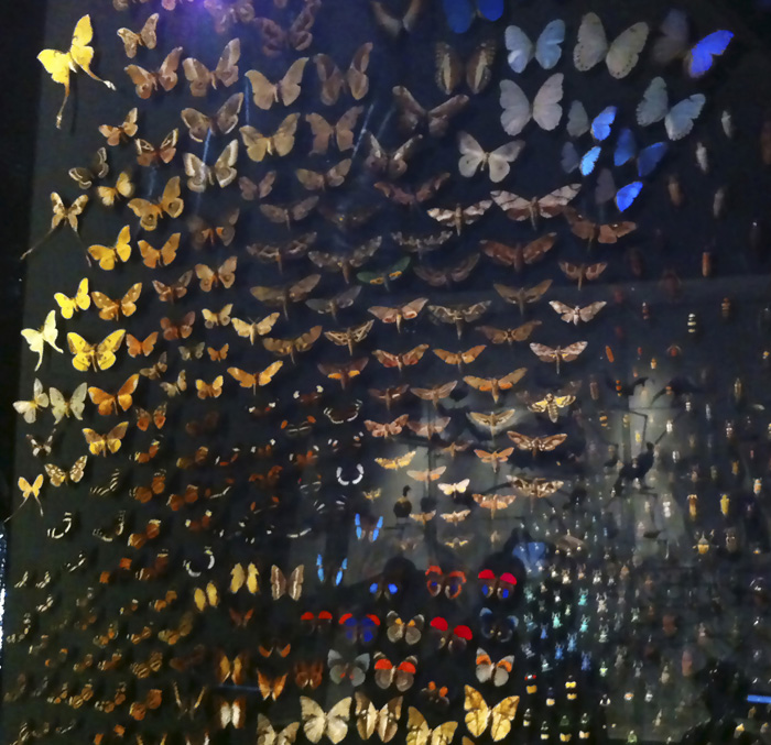 Installation : costume du Matador Juan Bautista ; boîte de 4 scarabées (plusotis resplendens), Costa-Rica ; ceinture de kimono brodée en fil d’or, Japon ; bijoux romains issus des fouilles du Rhône, Arles. |