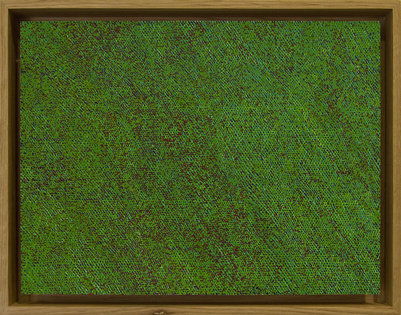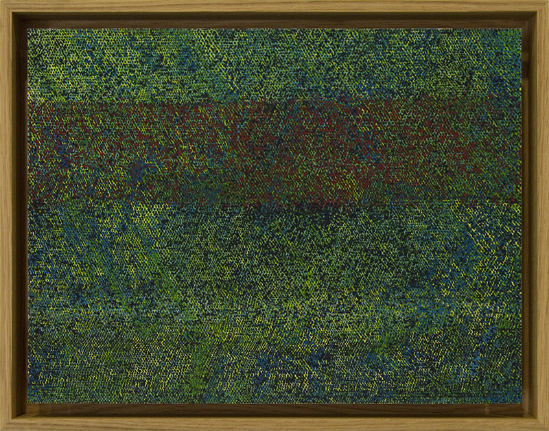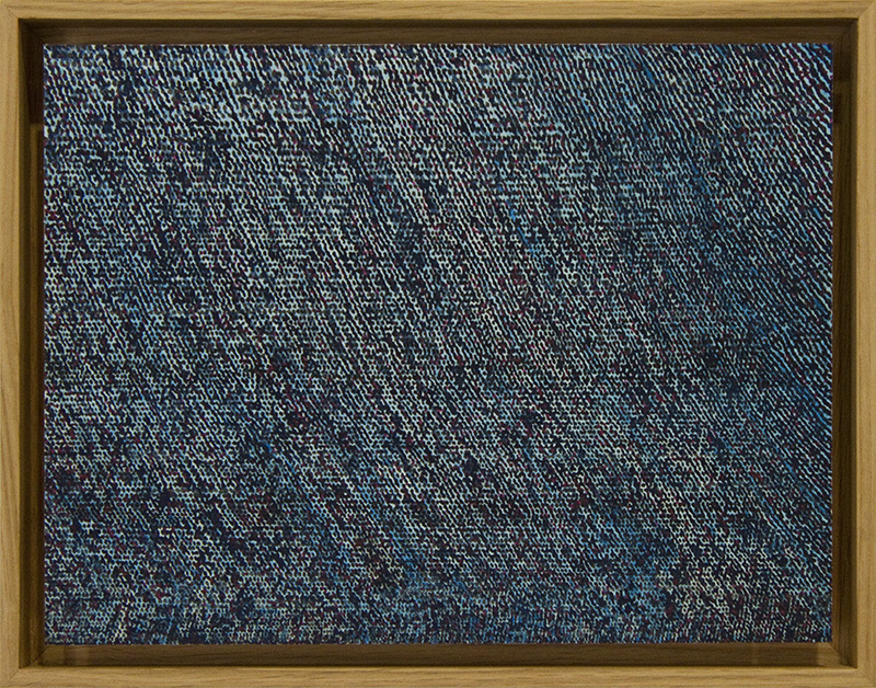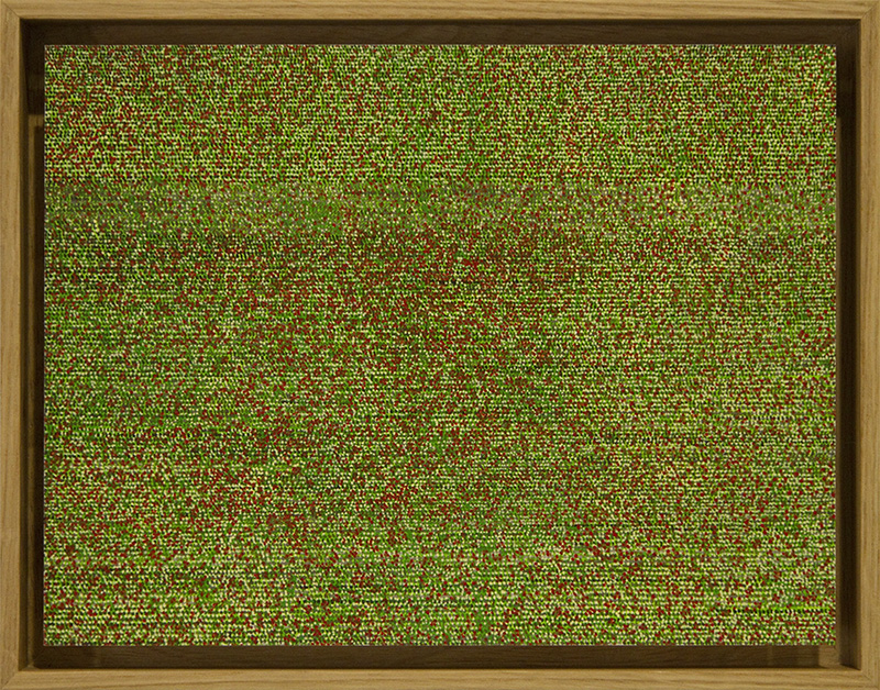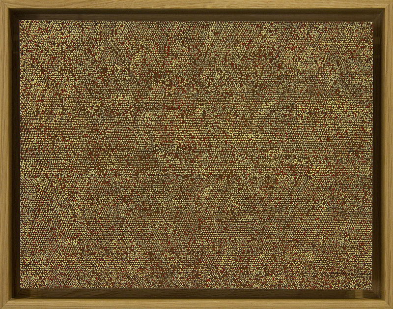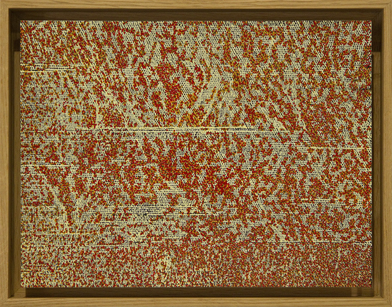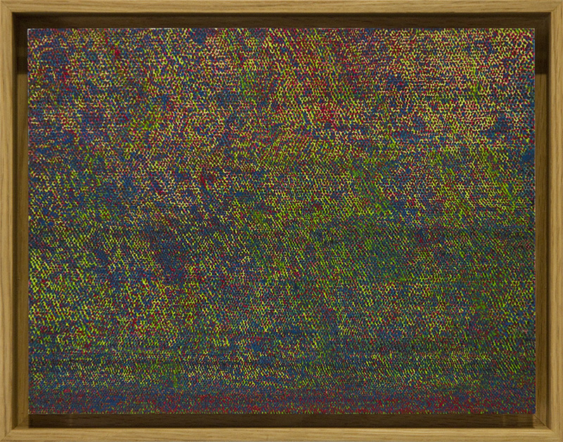 Ensuite, l’application d’une couleur dans les diagonales pour dessiner un mouvement global. Puis, des successions de points colorés dans les interstices et ce qui semble devenir des interstices.