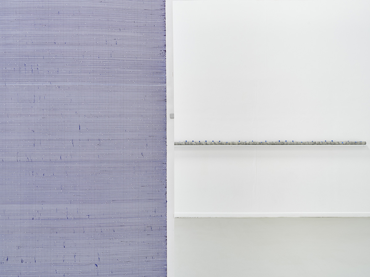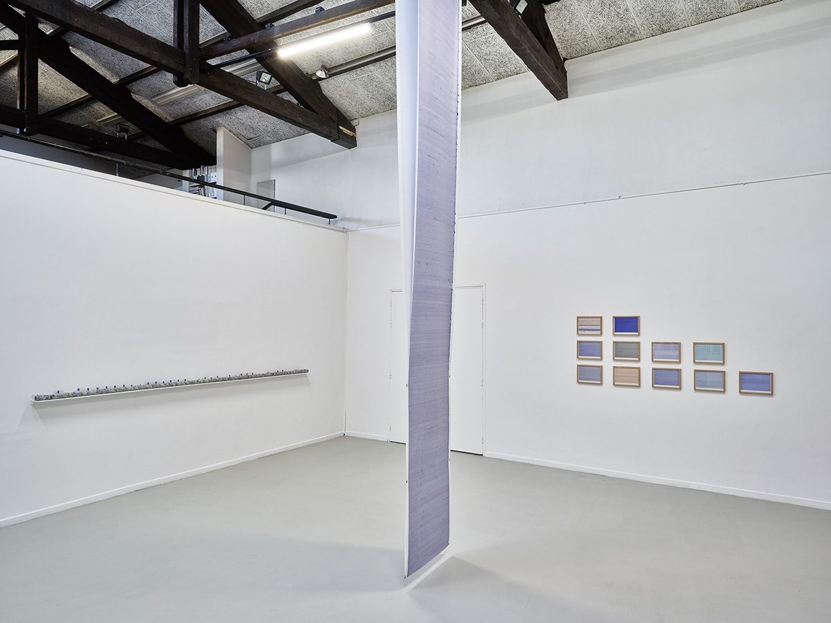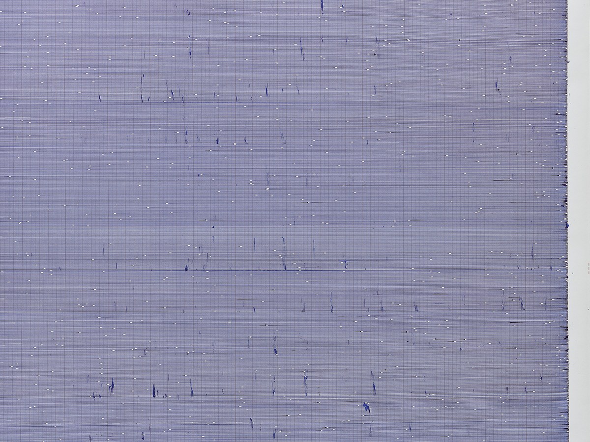 Au gré des journées, la partition dessinée désormais à 6 mains se remplissant 20 cm par heure sur la surface du rouleau de 10 mètres laisse entendre, crescendo, une coloration bleutée des corps à l’ouvrage, à la cadence d’un blues troué d’infimes diminuendo. Les micro-intervalles apparaissant entre la ligne et les zones de réserves millimètrent graduellement une micrologie successive et croissante de pleins, de vides et de bavures d’encres façonnant la simplicité du trait comme ébauche de l’immense.