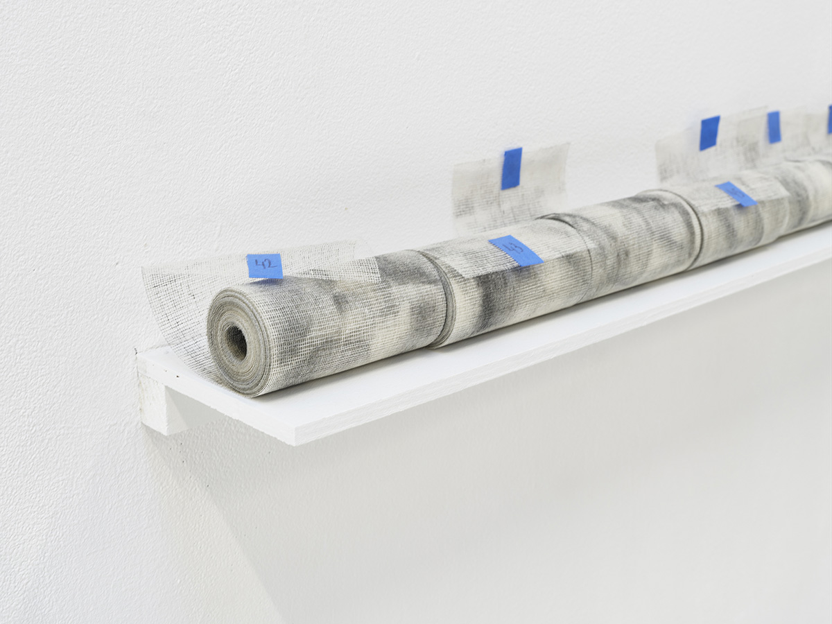 Opus Incertum désigne les carrelages composés de morceaux de carreaux cassés, de différentes couleurs en grès cérame. Le sol de l’atelier de résidence du 3 bis f, ancien dortoir du pavillon de femmes internées dites agitées, en est un, que Lina Jabbour a préalablement restauré en curant minutieusement les tâches de peinture, vernis, adhésifs et autres traces inhérentes au travail de l’atelier. Prolongeant ce geste esthétique de réparation elle y a ensuite apposé une étoffe de tarlatane, tissu de coton utilisé pour les plâtres, bandages et fissures de murs et prélevé 61,61 mètres carrés de la surface de cet ancien espace de sommeil, par frottage au graphite.