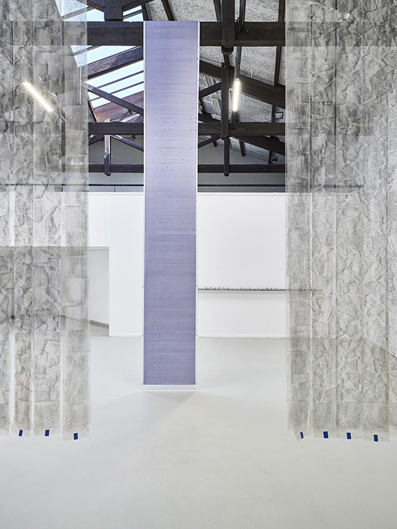 Suspendues en 73 bandes à l’entrée de l’espace, numérotées selon la classification d’un répertoire inhérent aux opus, l’empreinte du sol est hissée à la verticale, le sol diésé par cette bascule de 90 degrés devient une peau spectrale, telle une mue, dont l’exuvie fait apparaître son double incertain.