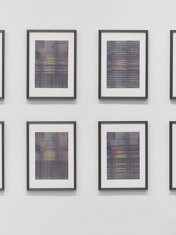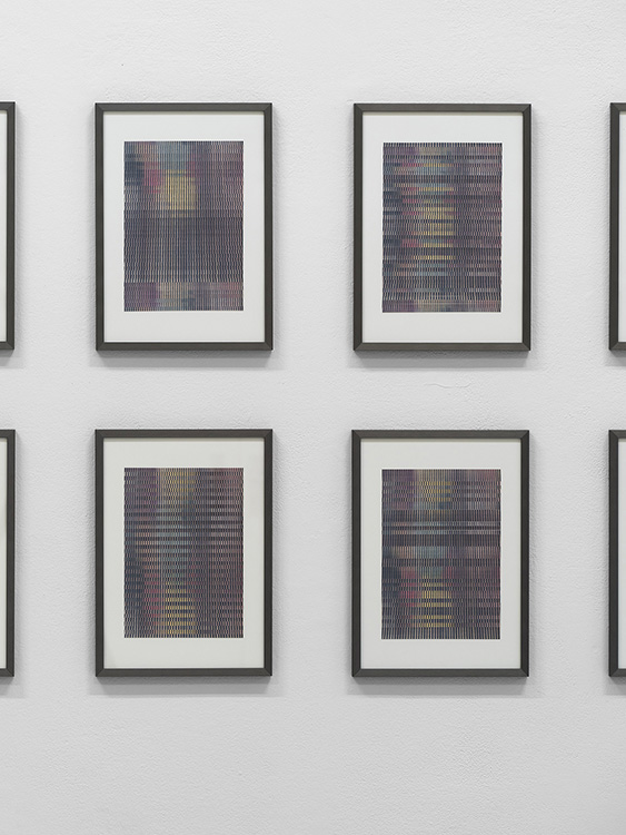 La série des onze : Dessins tests réalisés in situ à la blanchisserie, est un travail préparatoire au dessin suspendu : Sismographie cosmique. Leurs variations chromatiques sur papier millimétré, les différents essais de tracés et pointillés, ainsi que les mines de stylos employées, rend compte des hésitations et recherches entamées par Lina Jabbour pour tenter d’encoder les vibrations de la calandre avant de trouver sa méthode. L’entrée en matière dévoile un dénominateur commun : la présence d’espacements et zones de réserves dans chaque dessin. La série ainsi rassemblée suggère l’idée de gammes dont les écarts, formés par les minuscules zones de blanc, produiraient un son à la façon des cartons perforés des limonaires.