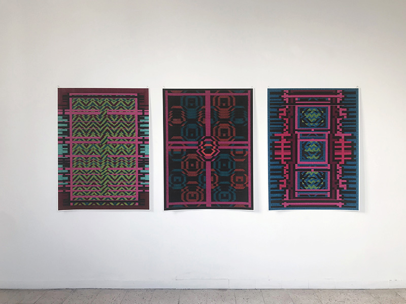 Première étape de travail : des études préparatoires sur format A4 librement inspirées de tapis orientaux. Ces esquisses sont dans un second temps scannées, agrandies puis découpées numériquement par bandes de 0,5 cm dans l’idée de déstructurer le motif initial, brouiller l’image telle une défaillance d’un système électronique. Un glitch. Un bug.
