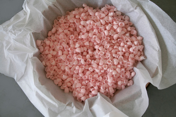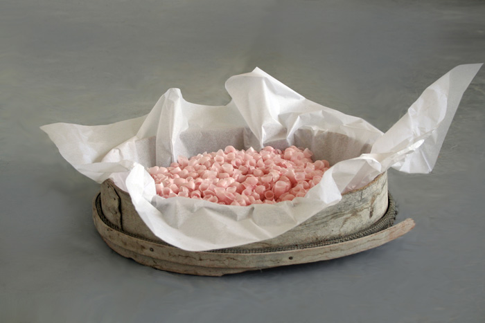Cire, paraffine, plexiglas, mousse polyuréthane, plumes, lait, 17 x 72 x 89 cm