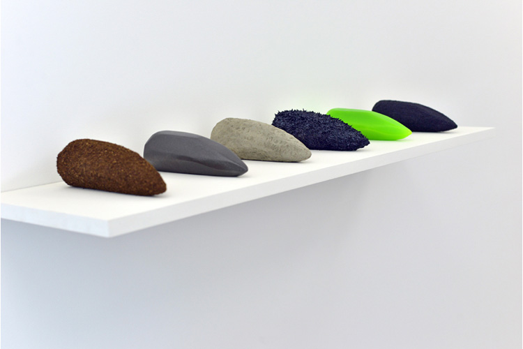 Terre, béton, peinture, silicone, paraffine, sable noir, 7 x 104 x 27 cm
