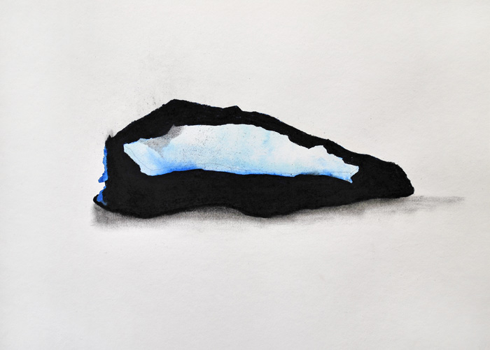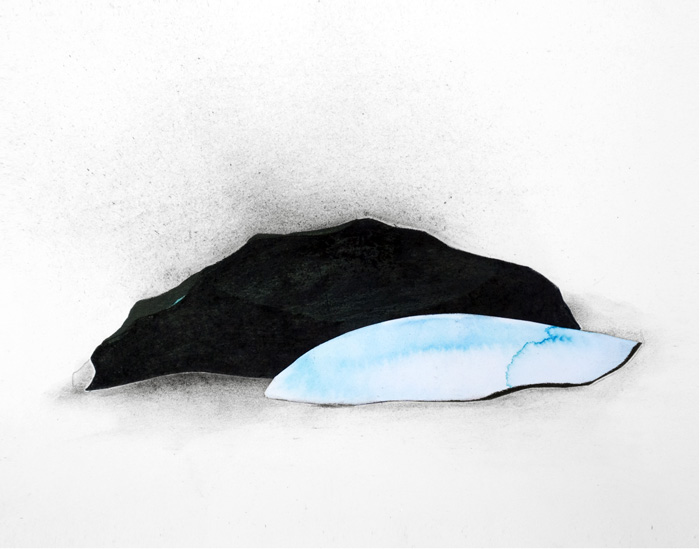 Aquarelle, pierre noire, pigments et collage sur papier, 24 x 30 cm