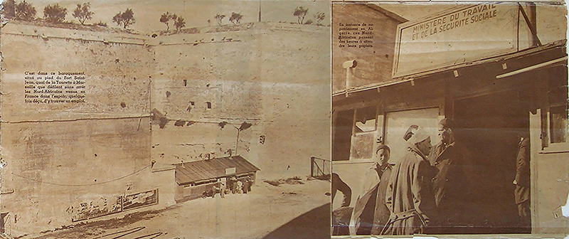 Marseille a été à la fois porte d’entrée et porte de sortie pour les dits « Travailleurs Nord-Africains ». Cette photographie de Charles Sinclair parue le 15 octobre 1951 dans le n° 276 de la revue « Qui ? Détective » en page 11 a été découverte avec les archives de l’ATOM en 1994. Elle est l’une des rares traces de ce petit « baraquement du Ministère du Travail et de la Sécurité Sociale » - une porte vers la France, aujourd’hui effacée. La légende indique : « C’est dans ce baraquement situé au pied du Fort Saint-Jean, quai de la Tourette à Marseille que défilent sans arrêt les Nord-Africains venus en France dans l’espoir, quelque fois déçu, d’y trouver un emploi. »