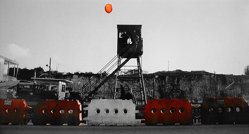 Le check-point d’Al-Ram et le ballon rouge sur lequel est représenté un portrait de Yasser Arafat souriant.