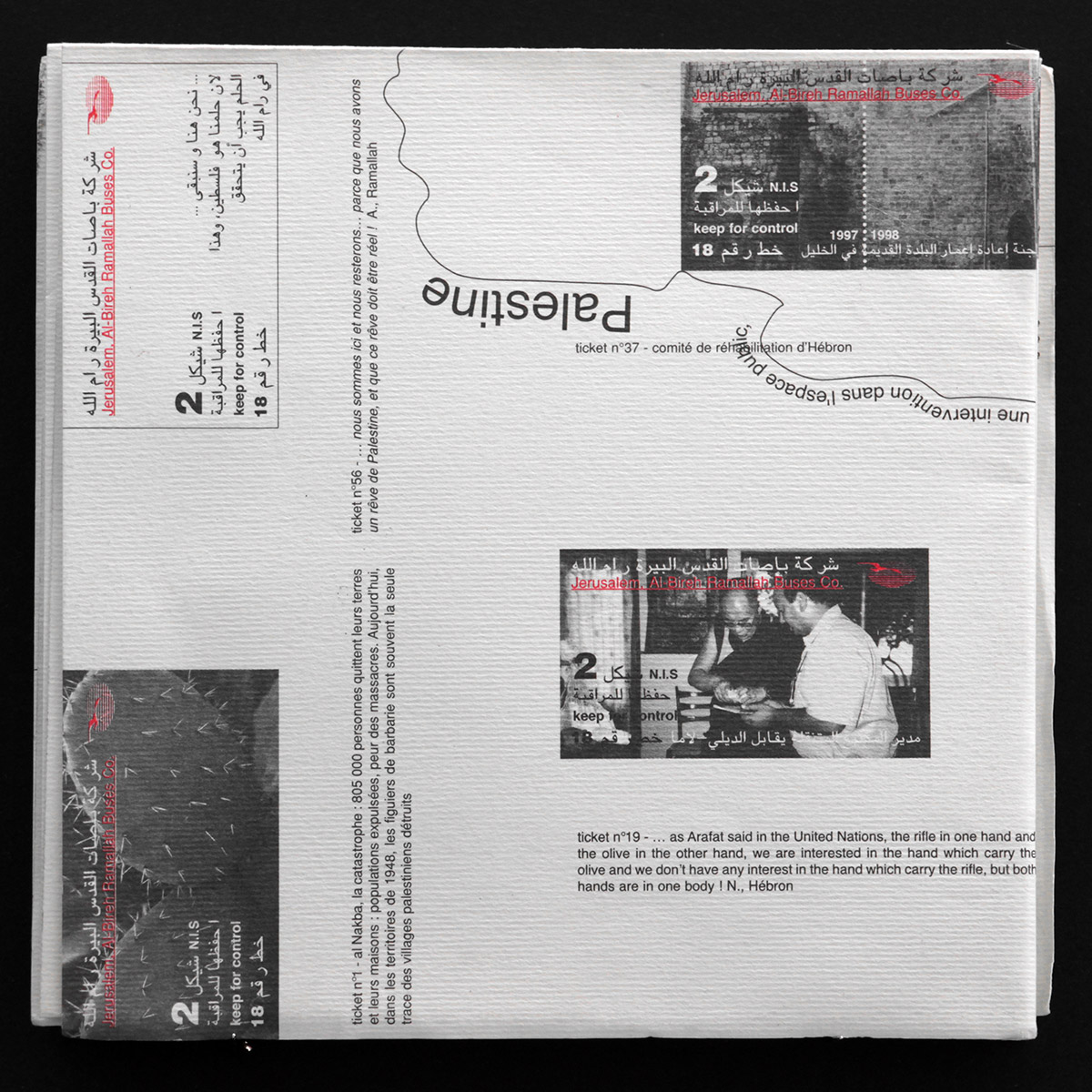 | En Palestine, il n’y a pas de petites résistances est un projet conçu et réalisé avec Martine Derain entre 1998 et 1999, suite à une invitation du Consulat général de France à Jérusalem nous proposant de concevoir une intervention artistique pour l’espace public palestinien. Nous sommes alors toutes les deux particulièrement intéressées par toutes les formes d’intervention artistique dans l’espace public et sommes particulièrement attentives à ce qui semble être - alors - un processus de paix amorcé depuis Oslo, en 1993, entre Israël et la Palestine. À cet endroit-là, le constat est implacable : nous recevons en pleine face la réalité d’un territoire émietté, fragmenté en Bantoustans, le contexte est ainsi jeté. En février 1999, lors de notre séjour commun, je me souviens, nous logions dans un petit hôtel plutôt agréable à Ramallah. Le lendemain matin, nous avions prévu de nous rendre au Centre Culturel Français de Jérusalem-Est. Nous sommes montées dans le bus, il y avait quelques personnes palestiniennes déjà assises. Lorsque le bus s’est arrêté au niveau du check-point d’Al-Ram, 2 soldats israëliens sont montés, armés, par l’avant du bus, ont marché lentement et d’un pas lourd dans l’allée centrale en inspectant du regard chacun(e) des passagers(ères) et contrôlant les papiers de certains seulement. Ils ont fait descendre un jeune homme et le bus est reparti. Le soir suivant, un moment de doute m’a envahie, qu’avais-je à faire à cet endroit-là ? La priorité n’était-elle pas ailleurs qu’à l’endroit de la création ? Ce sont les mots d’Hölderlin qui sont venus à mon esprit : À quoi bon des poètes en temps de détresse ? Je n’avais pas de réponse. Les rencontres avec Nafez et Anwar, entre autres, ne m’ont pas apporté plus de réponse, mais m’ont juste donné envie d’être-là. |