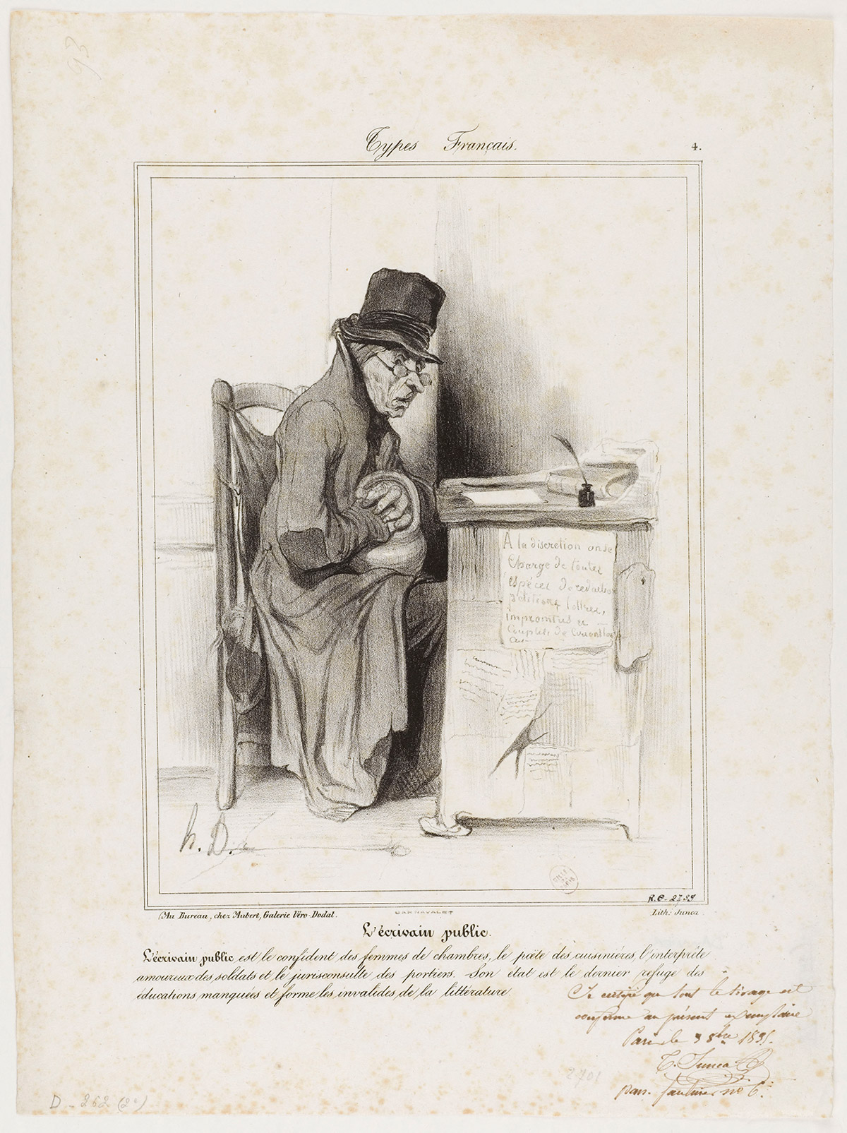 L’écrivain public apparaît comme une trace de l’inégalité face aux savoirs et notamment face à la lecture et à l’écriture. Héritier du scribe antique ou du barde gaulois, il est un personnage qui pourrait sembler quelque peu anachronique dans des sociétés où tout tend à s’informatiser. Au contact de Ben, en le sentant être avec les personnes qui franchissaient sa porte, une litanie d’adjectifs ont alors émergé pour tenter de comprendre son rapport à l’Autre : humaniste, rassurant, discret, accueillant, confident, réconfortant, simple, sécurisant, à l’écoute, sincère, tolérant, sensible (…), avec toujours le soin d’un rapport non-avilissant à l’Autre. Les rencontres avec d’autres écrivains publics ont montré que c’est à cet endroit-là, dans cet entre-deux, ce rapport à l’Autre, que se jouent des rapports de domination. Franchir le seuil de l’écrivain public n’implique-t-il pas d’emblée un sentiment d’infériorité ?