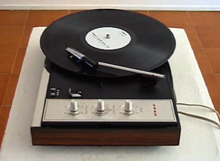Installation, tourne disque des annnées 80, disque vinyle 33 t, hauts-parleurs.
