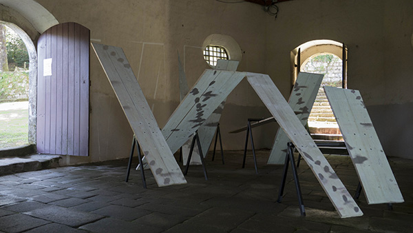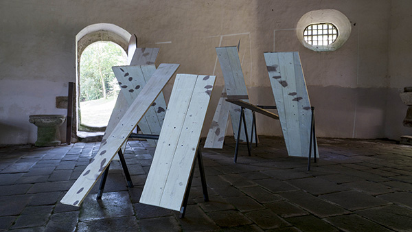 S’il y a une parenté avec les « aires de jeux » qui ont fait l’objet des recherches antérieures, ici le rapport à « l’usage » est déjoué par les détails de coupe des planches, l’inversion des fixations les rendant impropres à supporter du poids, et la fine couche de craie frottée sur le bois. Leviers, balanciers, tremplins formés par les différentes longueurs et inclinaisons tournent le dos à la verticalité attendue d’un écran, lui préfèrent l’instabilité du discontinu, l’incertitude de trajectoires obliques.