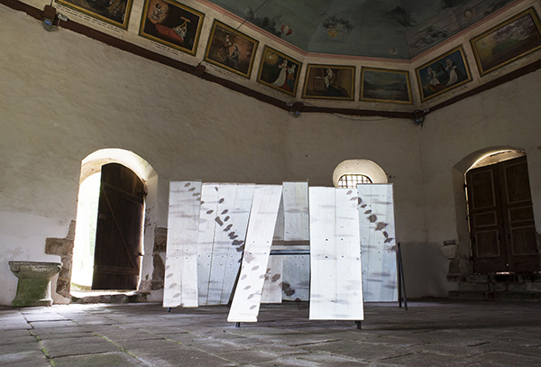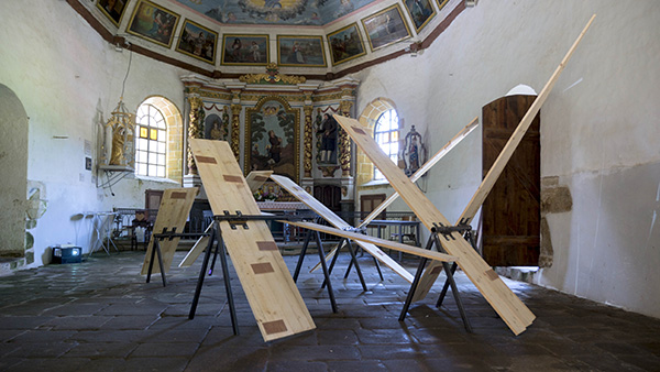 L’œuvre pour la chapelle Notre Dame du Guelhouit emprunte à ses dessins muraux leur mode d’occupation précaire et temporaire : il s’agit ici, littéralement, de ne pas toucher les murs, de ne pas « s’installer ». Tréteaux, planches de bois brut assemblées par « rapiéçage », simplicité de l’ensemble laissent percevoir la possibilité de bascule, de déplacement…