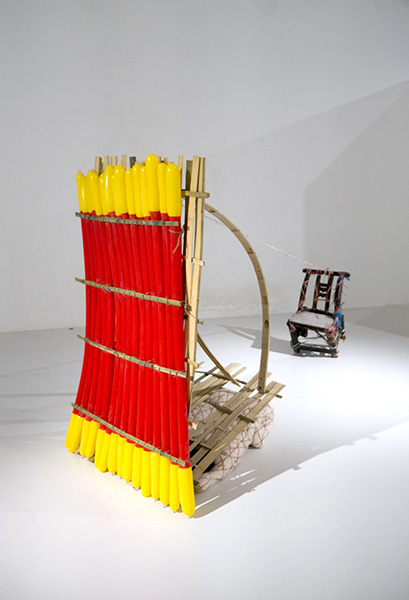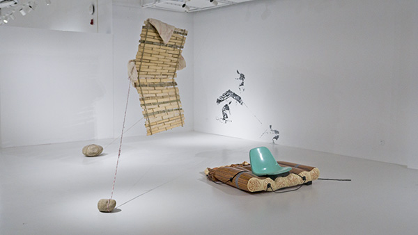 Dessin mural, vidéo 2'48 en boucle, gonflables, couvertures, palissades, chaises