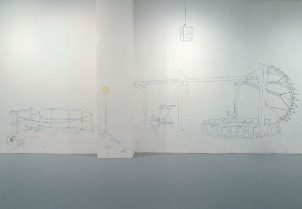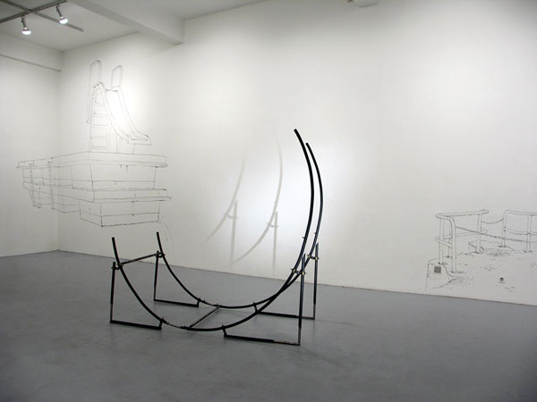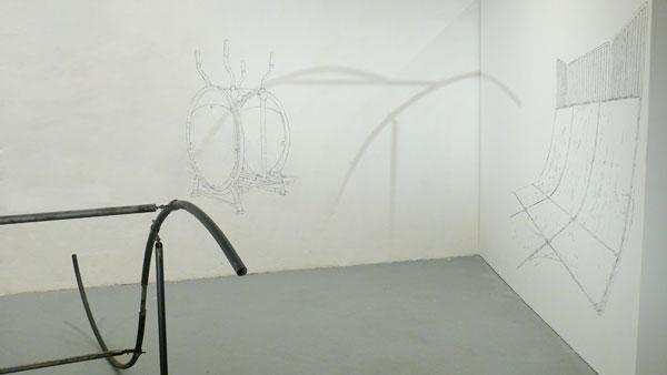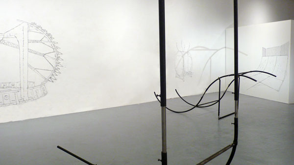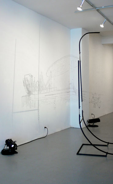 Vues de l'exposition Amorces, Carré Bonnat, Bayonne Dessins muraux (fusain), dessins sur papier, vidéo, projecteurs à découpe, structures tubulaires métalliques modulables