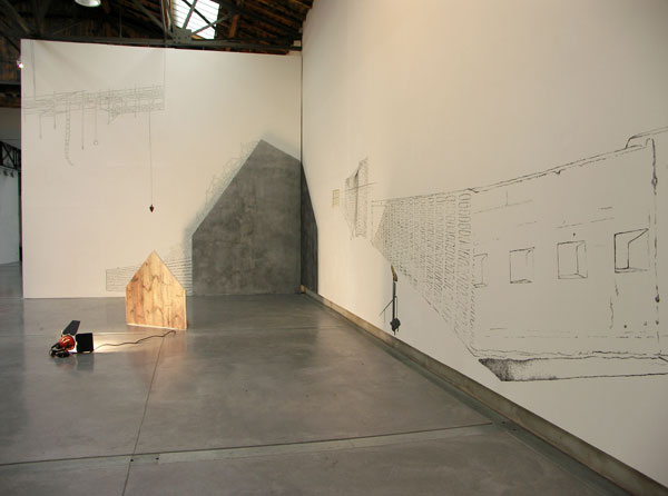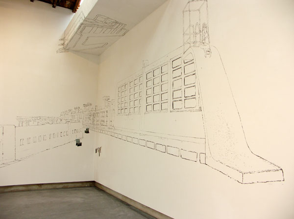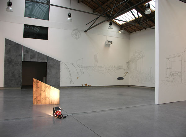 Vues de l'exposition "(...)artifice", Le 19 Crac, Montbéliard Dessins muraux (fusain), vidéo, autocollants photographiques, panneaux découpés, projecteurs (mandarines)